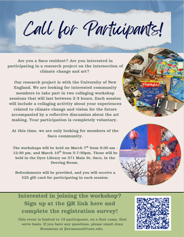 The University of New England is looking for Saco residents interested in taking part in two collaging workshop sessions that will last between 2-3 hours. Each session will include a collaging activity about your experiences related to climate change and vision for the future accompanied by a reflective discussion about the art making. The workshops will be held on March 7 from 9:30 am - 12:30 pm, and March 10 from 5-7:30pm. Refreshments will be provided, and you will receive a $25 gift card for participating in each session. If you are interested, please fill out the survey below to register!
