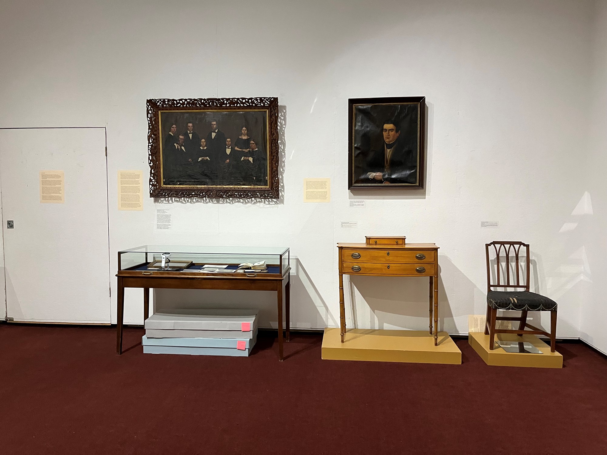 featuring new acquisitions as well as items collected during the early years of the museum, which was founded as the York Institute in 1866. Case studies presented around the perimeter of the room included an area devoted to condition and conservation, highlighting the value of original materials to an understanding of an artifact as well as a discussion of remedial treatments to stabilize and repair damage inflicted over time to two different paintings. The value to the collection of two “separate but equal” chests of drawers recently acquired was also discussed with interpretative panels explaining why each one has an important role in the collection. The histories and stories behind the objects selected for the exhibition were also highlighted. The stories of the Staples family as well as the ladies of the Methodist Church in Saco were represented through paintings and documents.