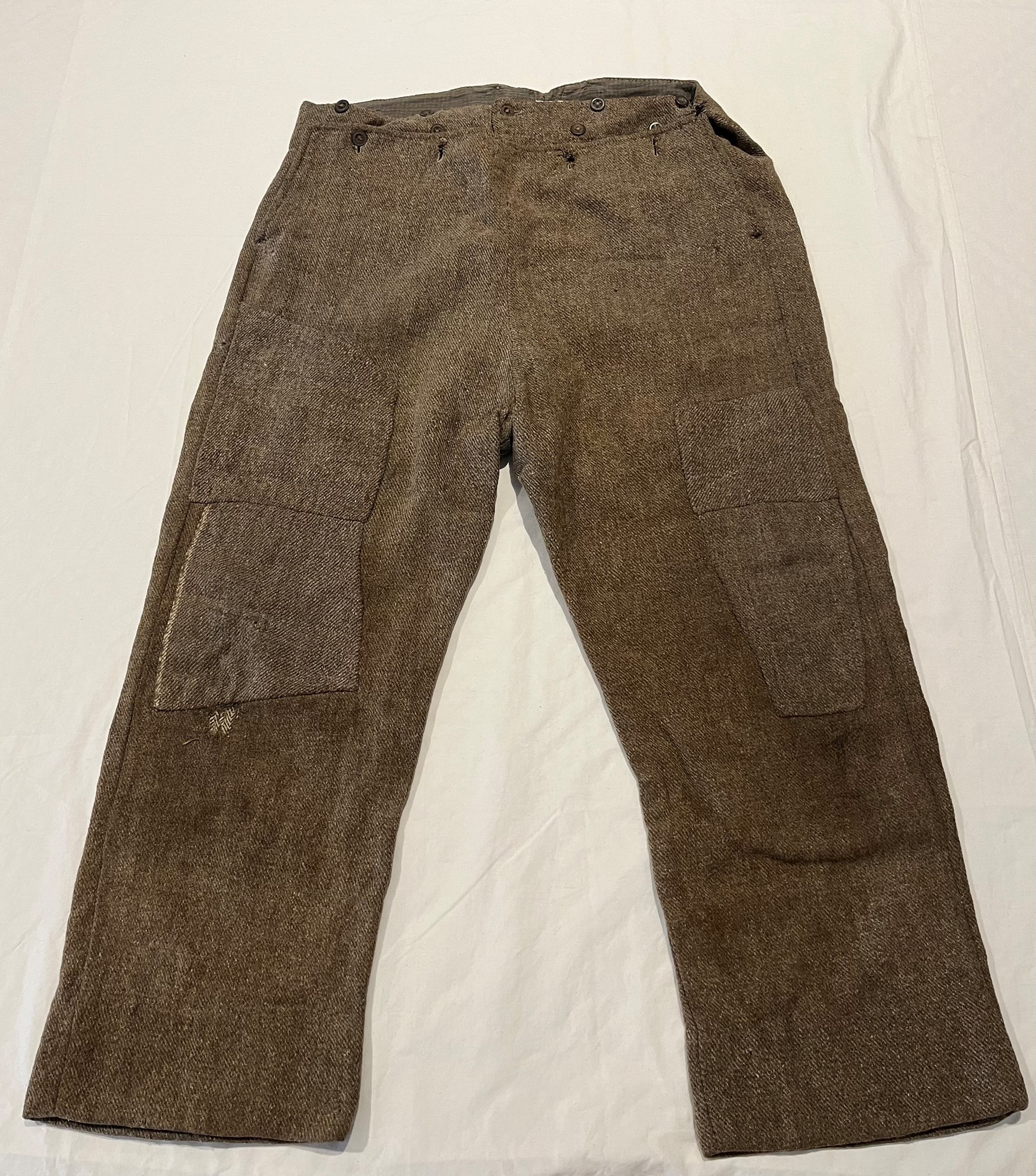 These pants are a great example of everyday work clothes, something that rarely survives to end up in a museum collection. They are of a heavy wool twill and are entirely hand-sewn. They also are heavily patched with a similar wool twill, with four patches on the front of the legs and two oval patches on the seat of the pants. They were clearly worn for many years before being put away.