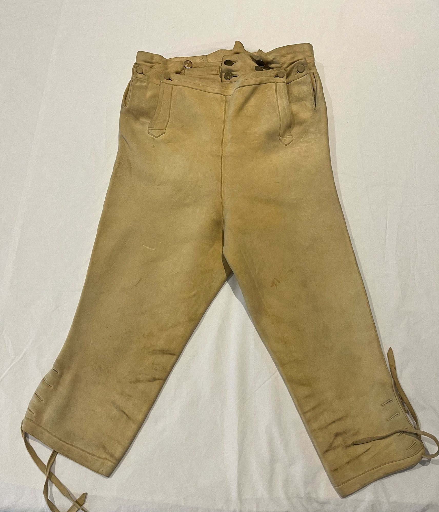 The clothing items that end up in museum collections are rarely representative of the range of garments worn in the past. Most people tend to save special occasion attire or other items that they have some sort of sentimental attachment to, such as wedding dresses or children’s clothing, while seldom making a point to save their more mundane everyday clothes. People also are much less likely to save men’s clothing of any sort, which is why we are fortunate to have a number of examples of everyday men’s clothing from the 19th and 20th centuries in our collection. Below are a few examples; you can see more at https://hub.catalogit.app/saco-museum/folder/clothing-and-accessories. While we don’t know who originally wore the leather breeches, the other items all were owned by local men.