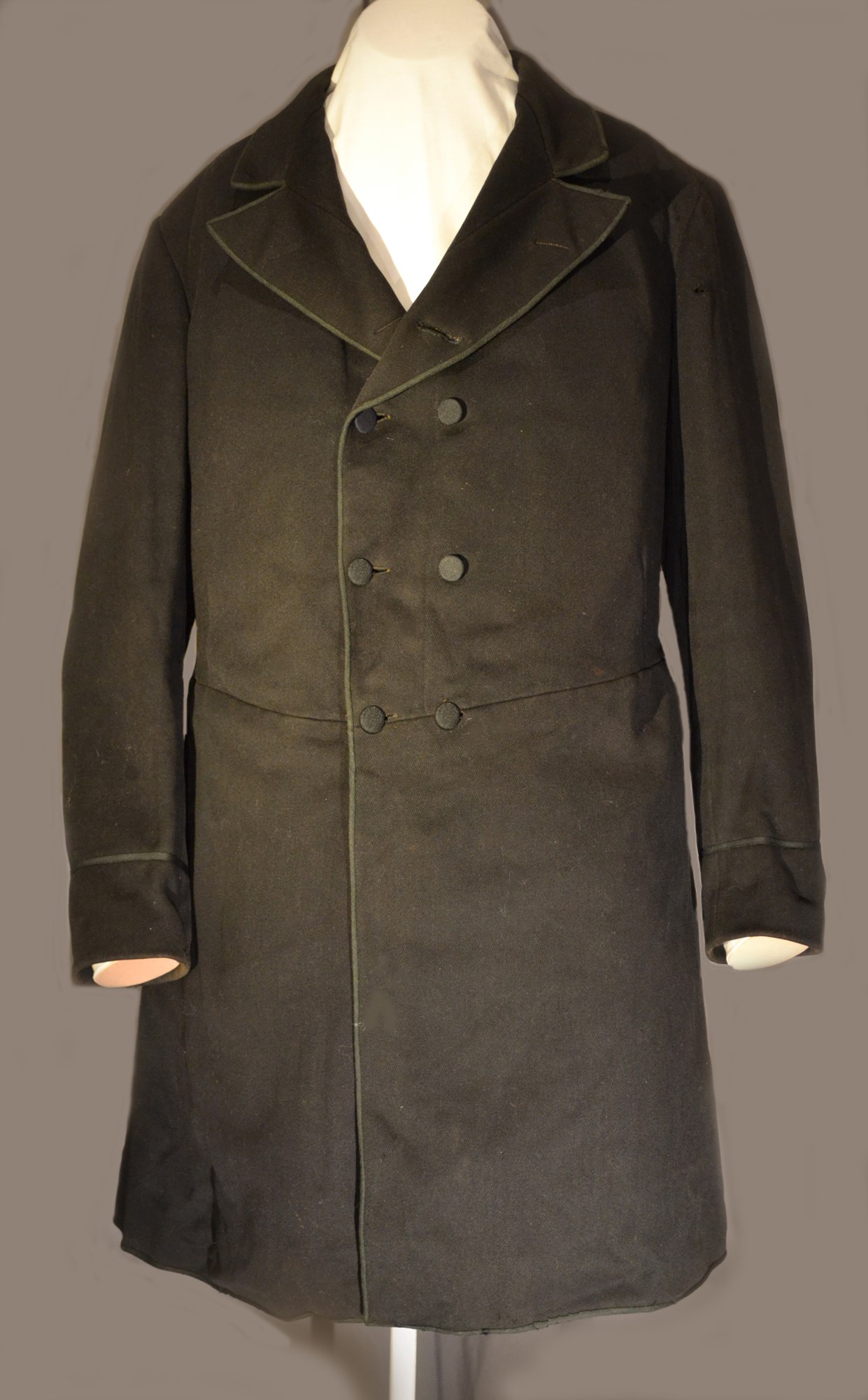 By the mid-19th century, the frock coat was considered an essential part of a man's wardrobe. Although they were made of a variety of fashionable fabrics, black wool was probably the most common material. Frock coats worn with straight trousers, a short vest, and a shirt with a high collar formed the basic man's “business suit” of the 19th century.