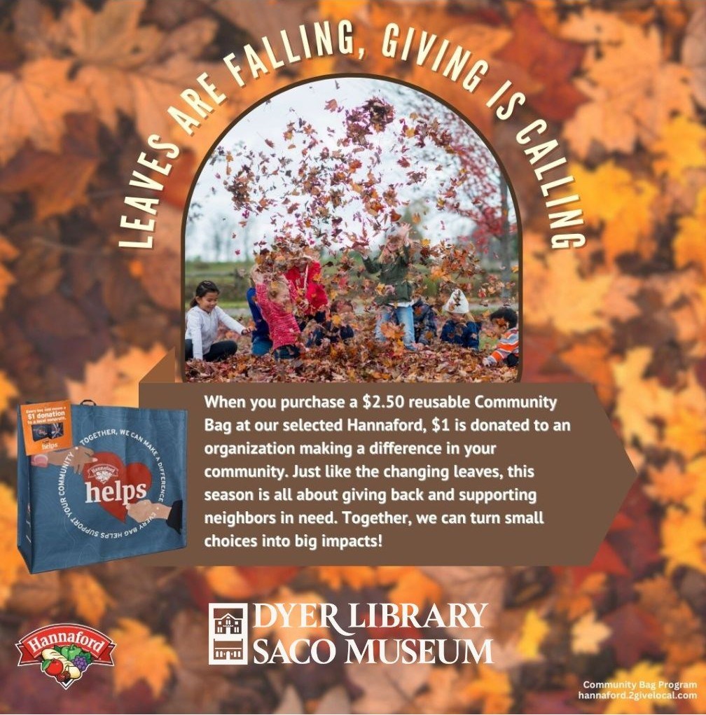 We are delighted to be selected as the Hannaford Community Bag Program partner for this month! This means that Dyer Library/Saco Museum will receive $1 for each $2.50 reusable Community Bag sold during the month of October 2025 at the Saco Hannaford, located at 532 Main Street, Saco. It's a great way to contribute to your community!