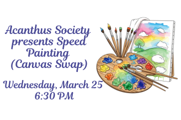 Acanthus Speed Painting (Canvas Swap) Date: Wednesday, March 25, 2026 Time: 6:30 PM - 7:45 PM Presenter: Acanthus Art Society Location: Makerspace Each person gets an 8x10 canvas board and chooses some acrylic paint colors they would like to start working with. Each person starts to paint on their own canvas. After a minute or two, your canvas is passed to the person on your left, for them to add to your canvas. This continues until you get your original canvas back. You will then have a few minutes to add any last minute details to your own canvas. All supplies included. No experience necessary.