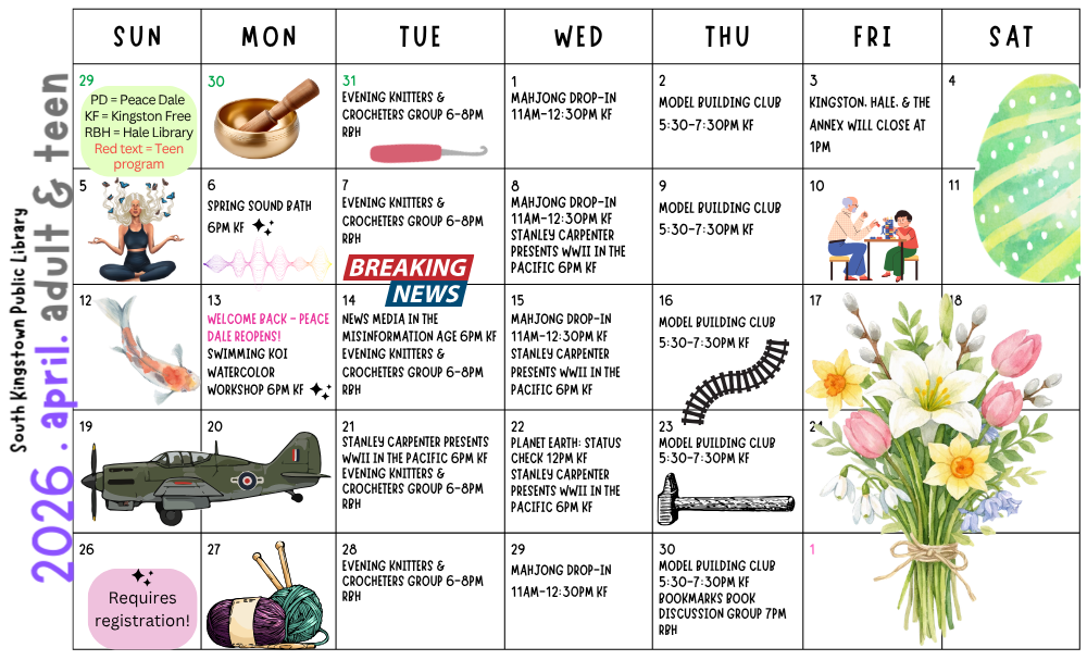 Kingston Free Library MAHJONG DROP-IN WEDS APRIL 1, 8, 15, & 29 at 11AM-12:30PM Drop by Potter Hall to play mahjong with your group. The library provides two mahjong sets (tiles, dice, pushers, and racks). Your own mahjong set also welcome. Ages 18+, no registration. No formal instruction at this time. Info: rflynn@southkingstownri.gov or 401-783-8254, ext. 4302. MODEL BUILDING CLUB THURSDAYS 5:30-7:30PM Relax, Bring a project you are working on, whether it's a plastic model, a diorama, miniature figures, LEGOs, or anything else. All ages welcome, little builders need an adult. Bring your own tools. SPRING SOUND BATH MONDAY APRIL 6TH 6-6:45PM Celebrate Spring with this relaxing sound experience created with singing bowls, rain sticks and chimes. Seating provided, or bring a yoga mat if preferred. *Registration required*: Register HERE, or contact Robin at rflynn@southkingstownri.gov. Sponsored by the Friends of the Library. STANLEY CARPENTER PRESENTS WORLD WAR II IN THE PACIFIC WEDS. APRIL 8TH, WEDS APRIL 15TH, TUES. APRIL 21ST, & WEDS. APRIL 22ND ALL AT 6PM Stan is back! A 4-part lecture on World War II in the Pacific Theater: Pearl Harbor; Miracle at Midway; The South and Southwest Pacific; and On to Japan. No registration required. SWIMMING KOI WATERCOLOR WORKSHOP MONDAY APRIL 13TH 6-7:30PM Learn to paint “Swimming Koi” with watercolor artist and URI Assistant Professor Hongbing Tang. Adults 18+. Registration required: Visit tinyurl.com/SKK-watercolor, or contact Robin at rflynn@southkingstownri.gov. Sponsored by the Friends of the Library. NEWS MEDIA IN THE MISINFORMATION AGE TUESDAY APRIL 14TH 6PM Join acclaimed journalist Philip Eil for a conversation about the current state of news media, how we got to this complex and chaotic moment, and what we can do to maintain a healthy information diet. Info: rflynn@southkingstownri.gov. PLANET EARTH: STATUS CHECK WEDNESDAY APRIL 22ND 12-1PM Panel discussion with URI professors about the ongoing research investigating our interactions with the Earth system in a time of warming climate.