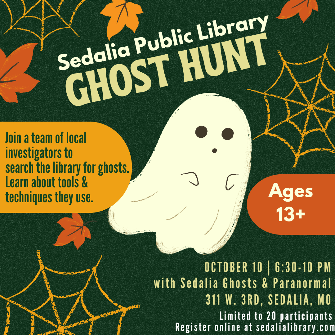 Ghost Hunt Learn about the tools and techniques real ghost investigators use—and then put them to the test as you search the library basement for paranormal activity. Open to adults and teens 13+ Fri Oct 10th, 6:30-10pm