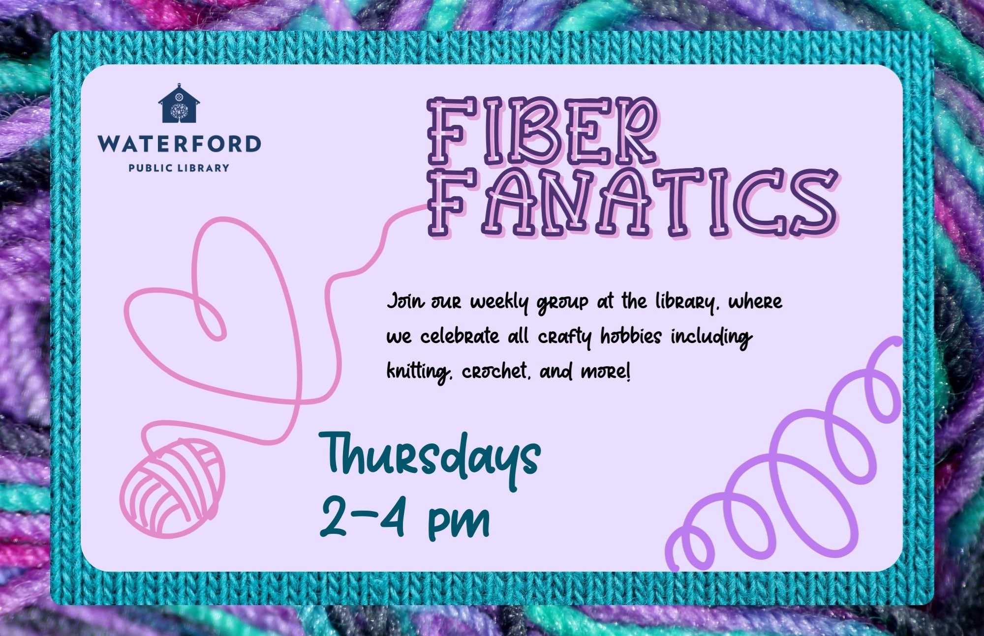 Fiber Art Fanatics Thursdays, 2 - 4 pm Join our weekly Fiber Arts Group at the library, where we celebrate all sorts of crafty hobbies—knitting, crochet, embroidery, and more! All experience levels are welcome. No registration required. Please note that this is not an instructional class, but a dedicated two hours to relax and work on your projects in good company.