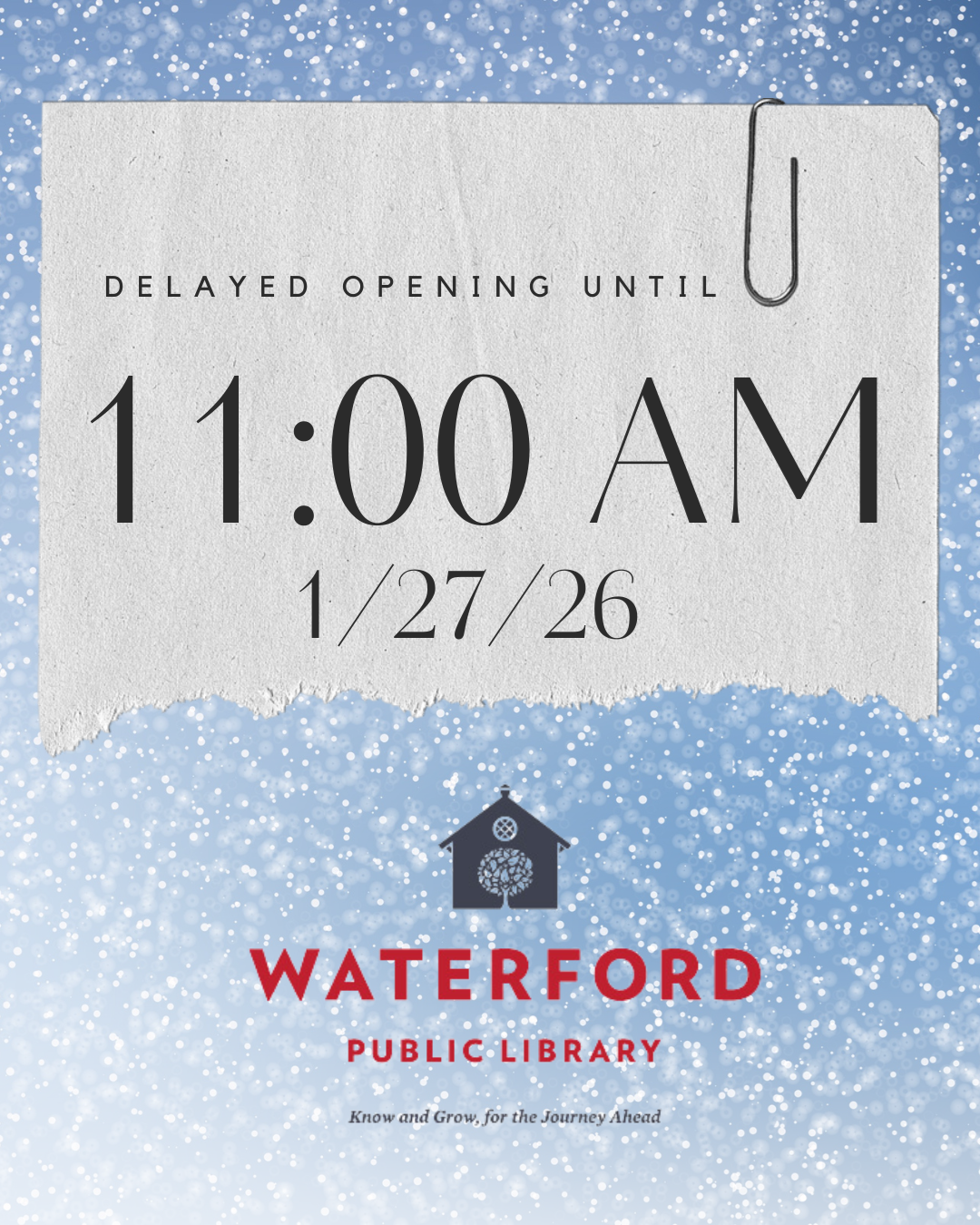 To ensure the safety of our patrons and staff, the library will be opening at 11:00 a.m. on Tuesday, January 27, 2026. Stay safe!