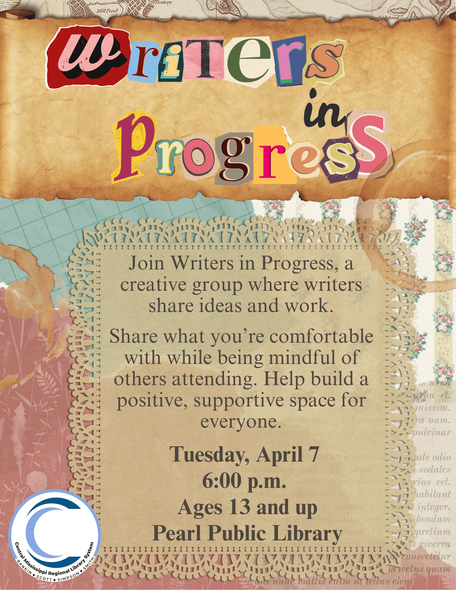 Writers in Progress Join us for the Writers In Progress group, a writers' group where we can share our work and ideas. Share whatever you're comfortable with. This is a creative space, so no putting other writers down! Ages 13+.