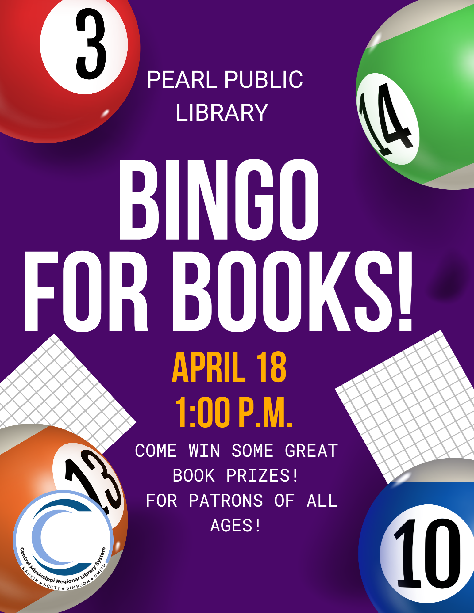 BINGO for Books Join us at the Pearl library for Bingo for Books, a lively monthly program where readers of all ages come together for a fun game night—with a literary twist. Participants will play rounds of Bingo for the chance to win free books as prizes, making it a great way to build their personal library while making friends.