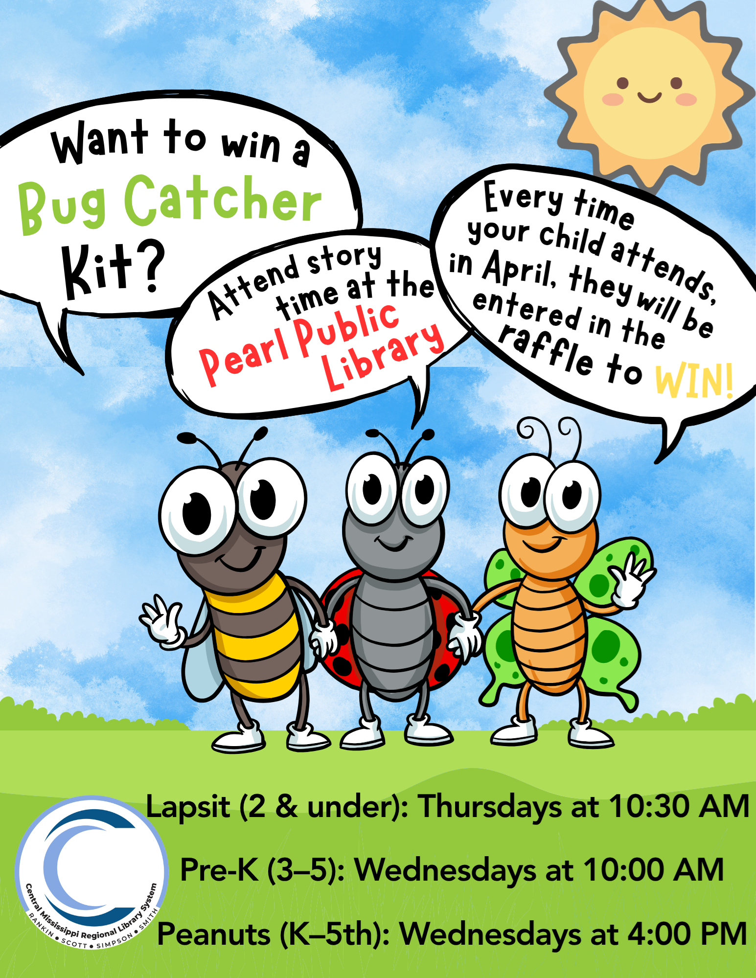 April Story Time Giveaway Come to any story time at the Pearl Public Library during the month of April. Every time a child attends story time, they will be entered into a raffle to win the prize. The 2 children whose names are drawn at the end of the month will each win a Bug Catcher Kit just in time for the summer!