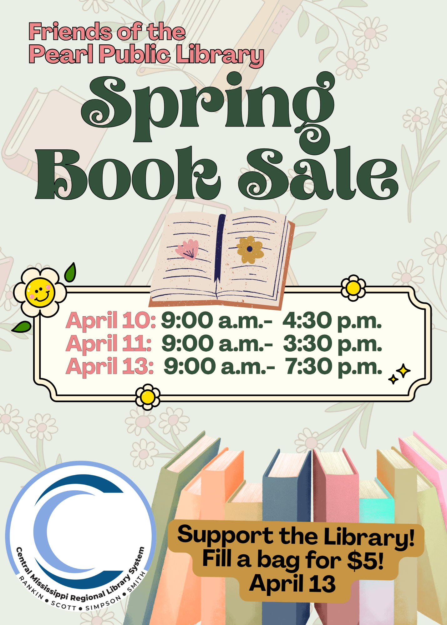 Friends of the Pearl Public Library Spring Book SaleThe Friends of the Pearl Public Library invite you to their upcoming Book Sale, a community fundraiser that supports library programs, services, and special initiatives. Browse a wide selection of gently used books, including fiction, nonfiction, children’s titles, and more—all at affordable prices.