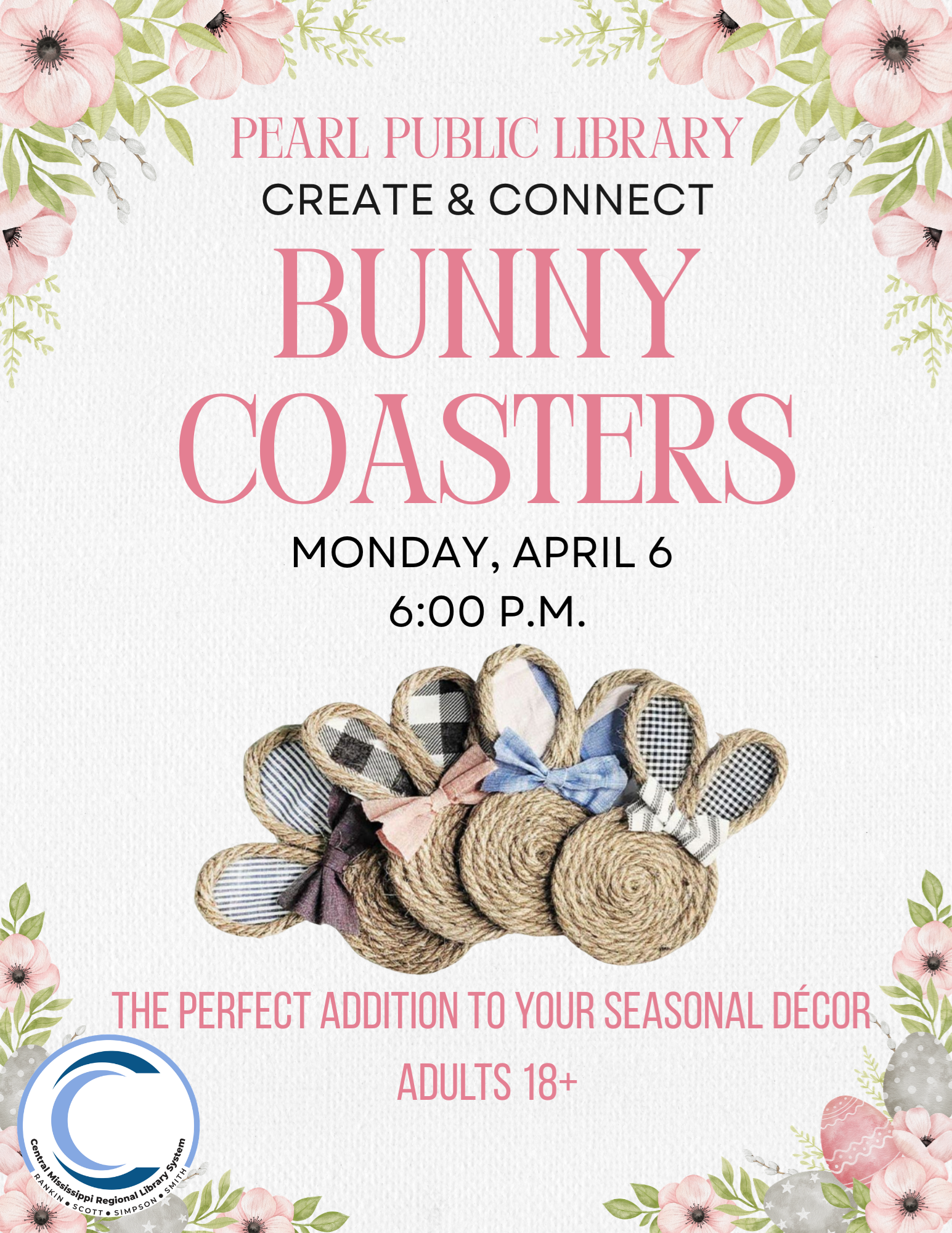 Create & Connect Create a cute bunny coaster and connect with fellow library patrons just in time for Easter! Adults only, all materials provided!