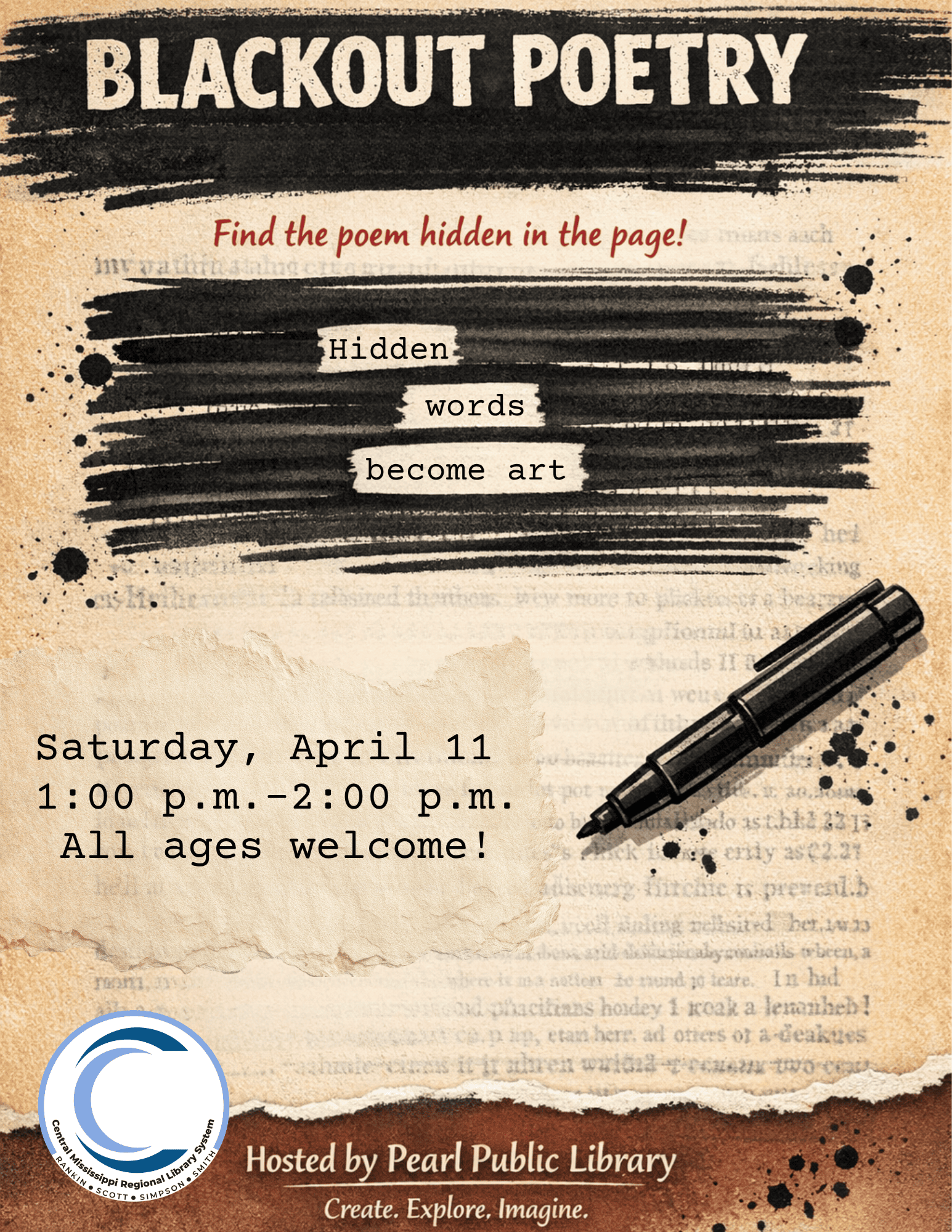 Blackout Poetry Create poetry in a whole new way! Participants will transform book pages into original works of art by highlighting selected words and blacking out the rest of the text. No experience needed. Supplies provided.