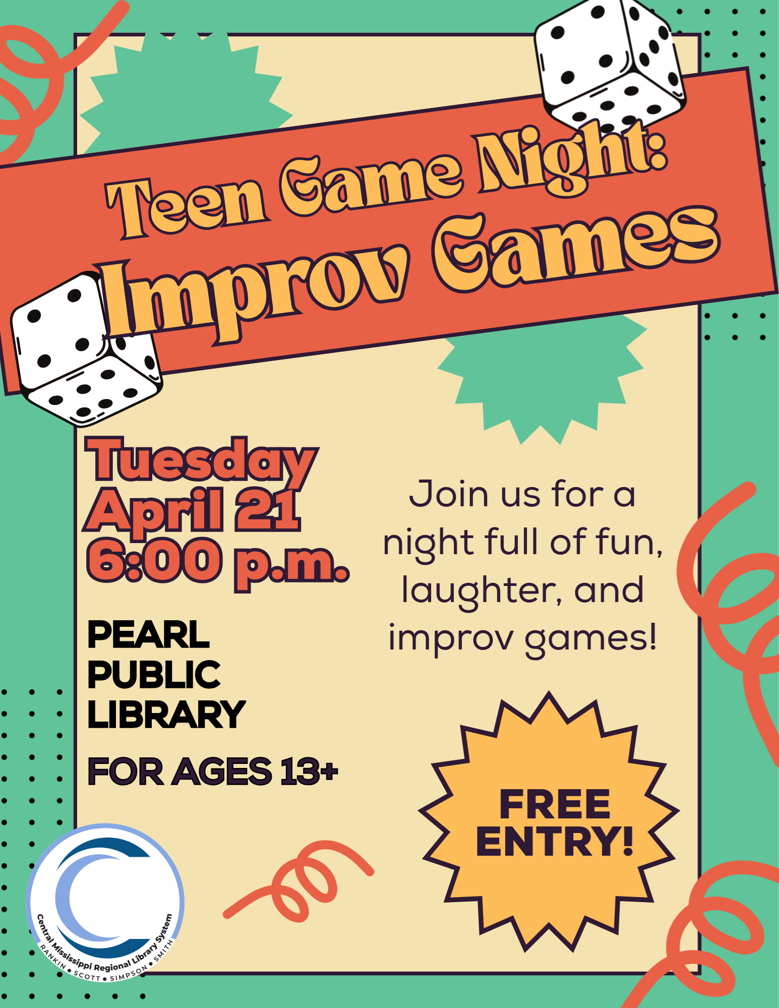 Teen Game Night: Improv Games Teens are invited to join us at the library for an evening of high-energy fun at Teen Improv Game Night! This interactive program is all about quick thinking, creativity, and plenty of laughs. Participants will play a variety of improv-style games that challenge you to think on your feet, work as a team, and step outside your comfort zone—no acting experience required. Whether you love being in the spotlight or just want to try something new, this is a welcoming space to relax, be silly, and have fun with friends. Come ready to laugh, create, and connect. Bring a friend or make new ones—either way, you won’t want to miss it!