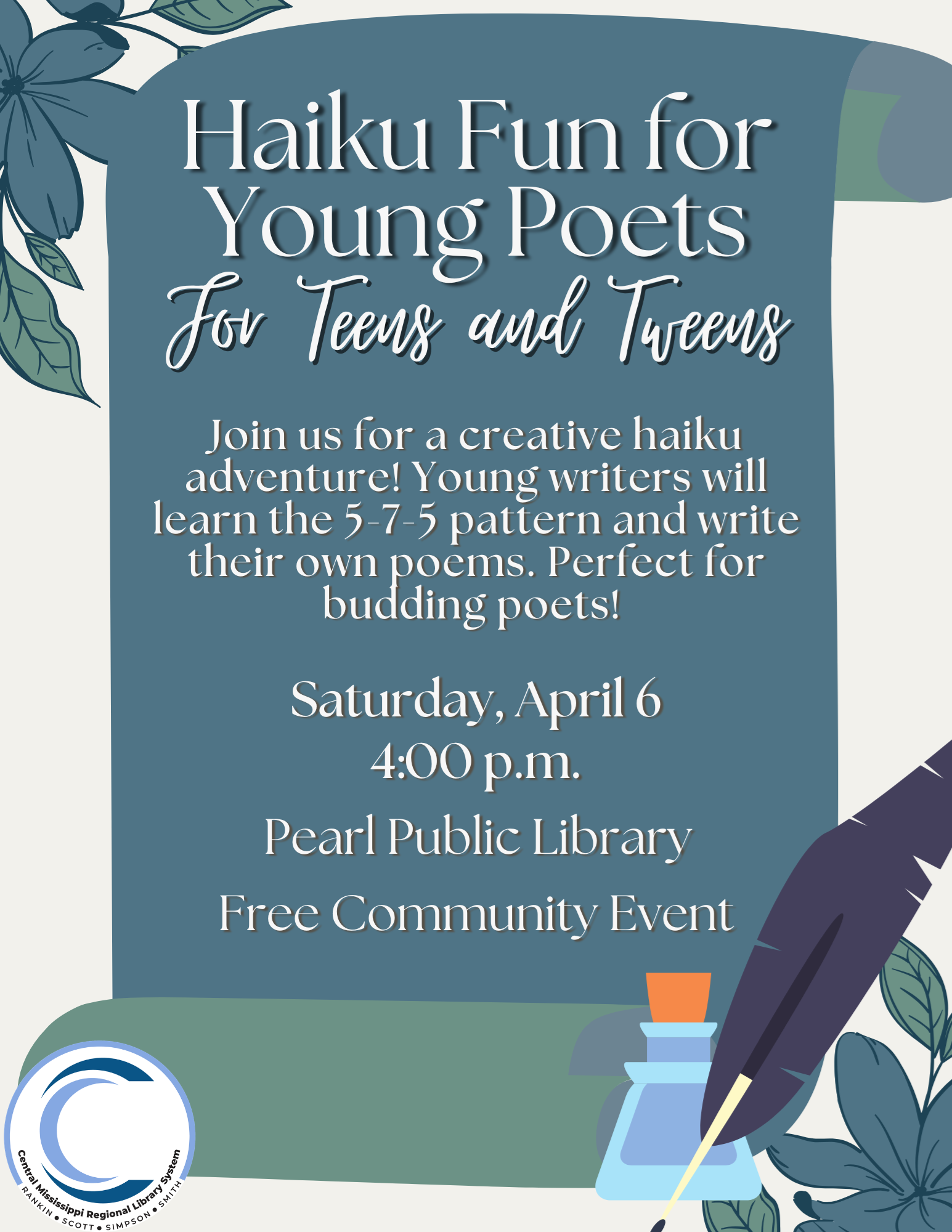 Haiku Fun for Teens and Tweens Join us as we celebrate National Poetry Month with creativity and imagination! Teens and tweens will learn the simple 5-7-5 structure of a haiku and create their own poems inspired by the world around them. This fun, relaxed program is perfect for young writers ready to play with words and express big ideas in just a few lines.
