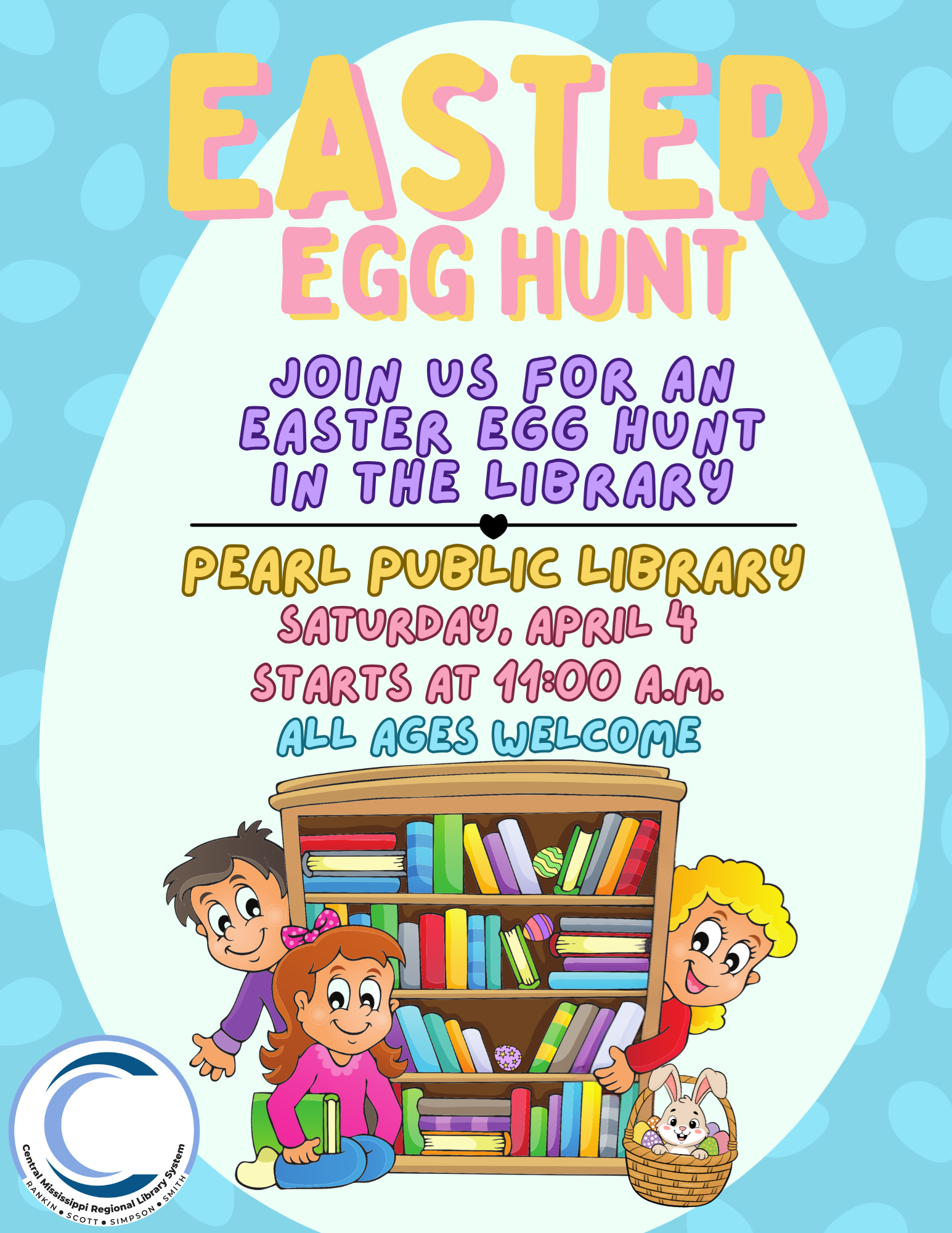 Easter Egg Hunt Join us for an easter egg hunt inside the Pearl Public Library after you finish your first egg hunt outdoors at the Mayor's Annual Easter Egg Hunt! Restrooms and water fountains open to the public during both egg hunts!