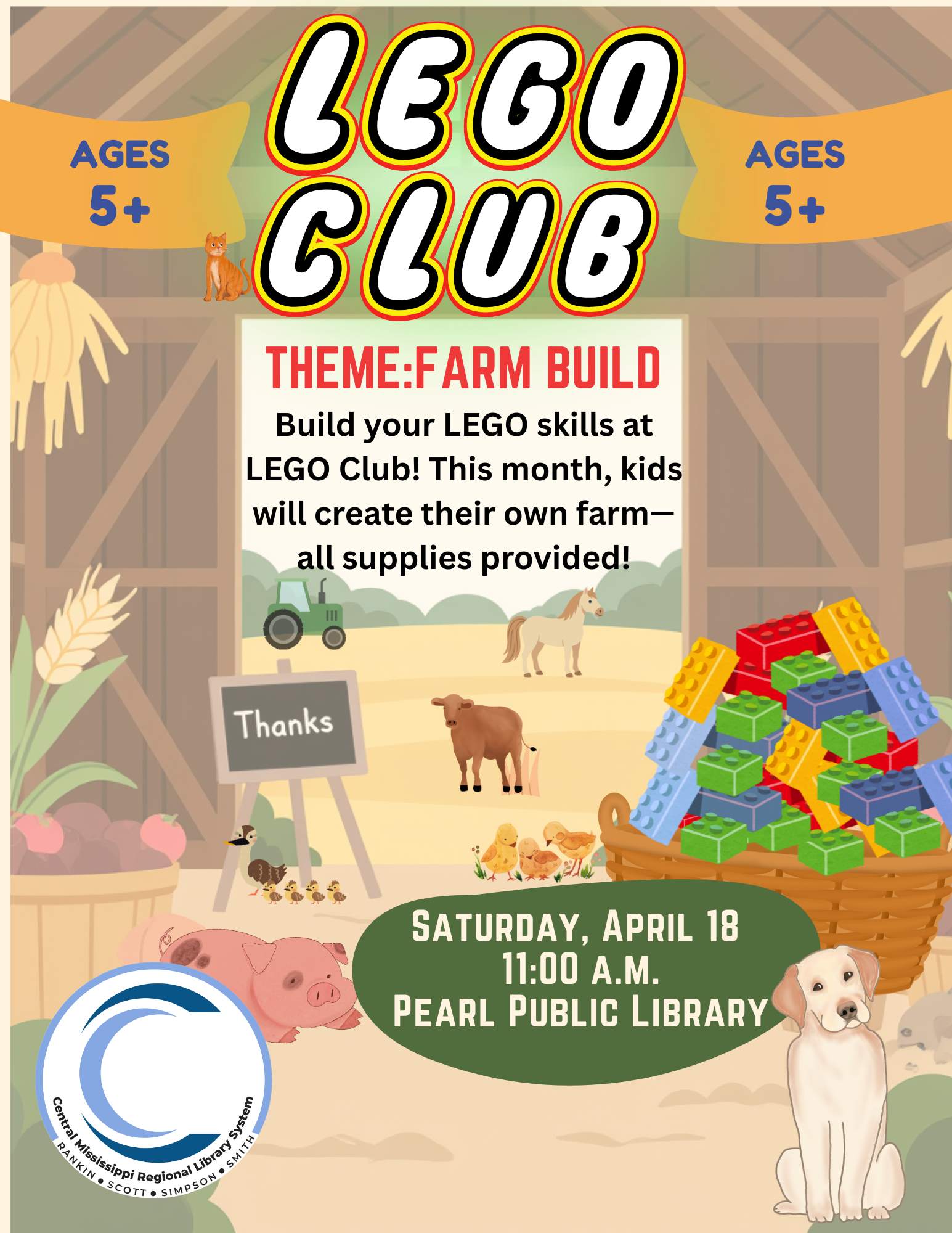 LEGO Club Show off your Lego building skills at LEGO Club! Our LEGO challenge this month is to build a farm! Ages 5+. Legos will be provided.