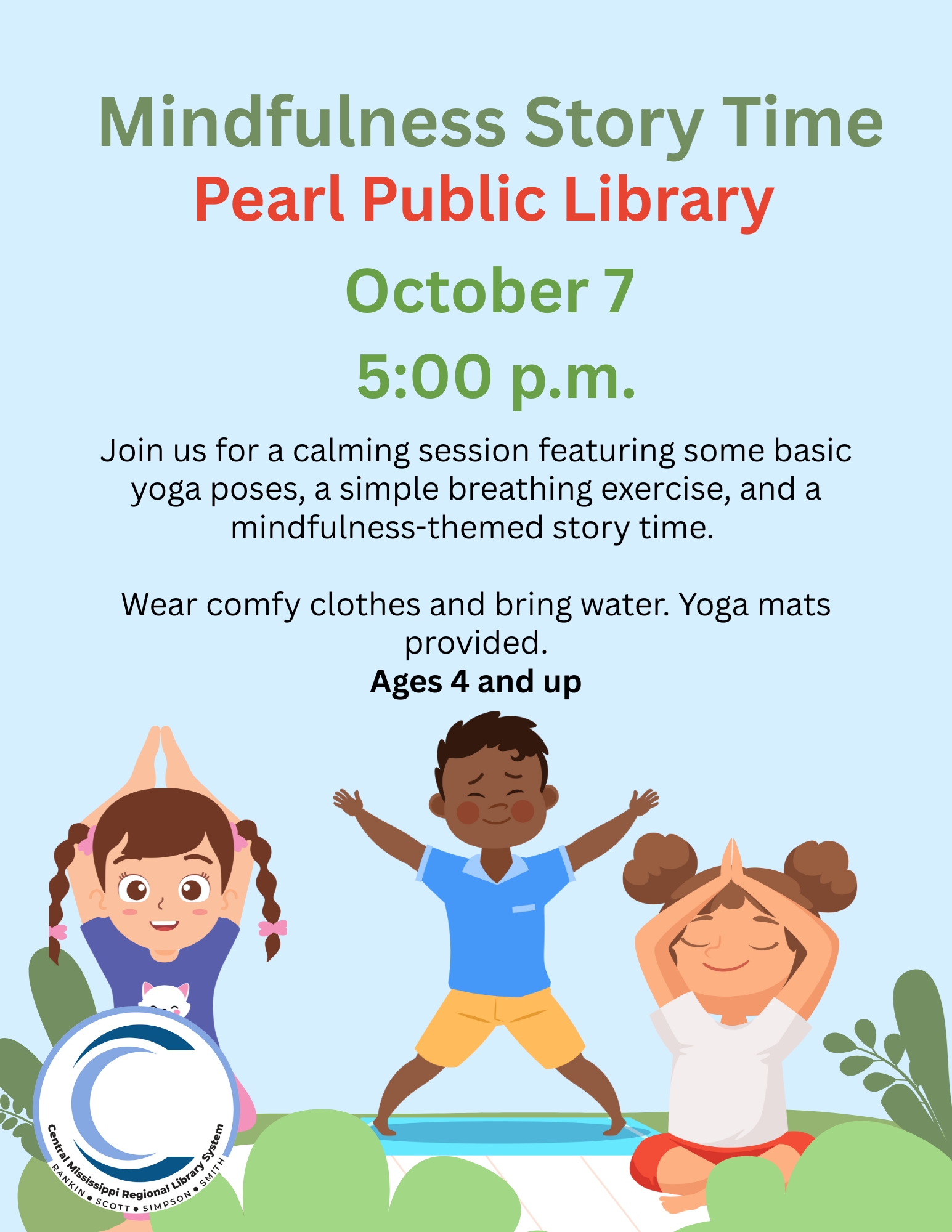 Mindfulness at the Library Everyone needs a chance to learn how to take a breath and relax. We will be teaching some basic yoga poses, a breathing exercise, and having a story time on mindfulness. Wear comfy exercise clothes and bring water! Yoga mats will be provided. For ages 4 and up. Parents and older siblings are welcome.