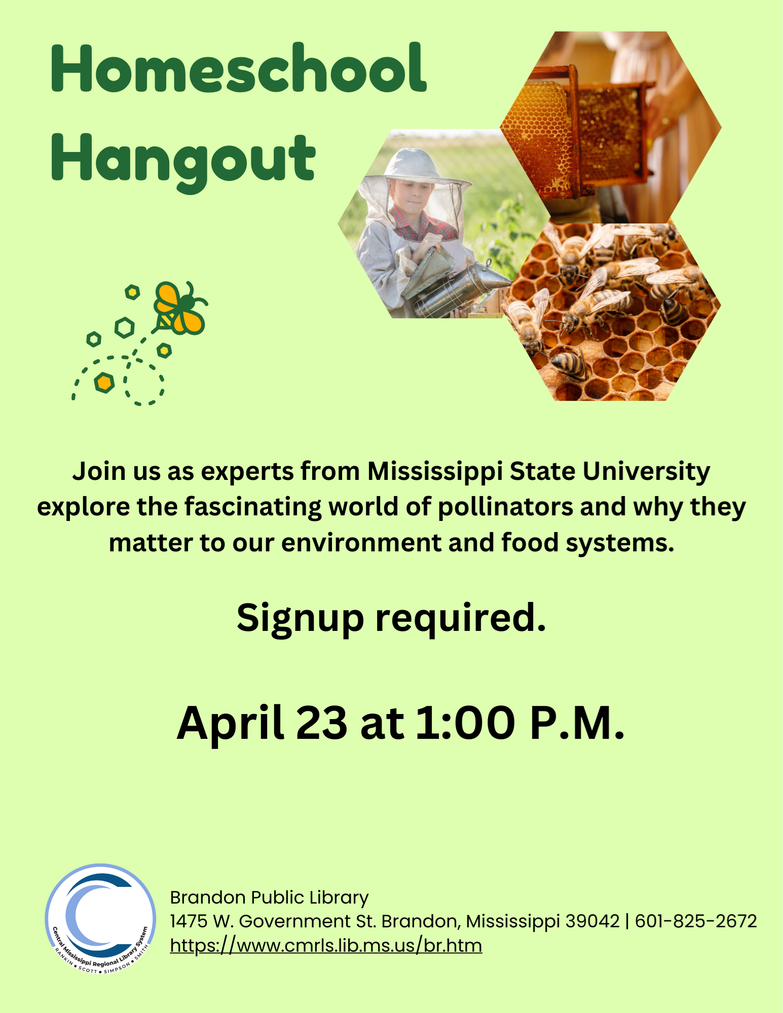 Saturday, April 4, at 10:30 a.m., we will be playing bingo! All families are welcome! Join us the third week in April as we celebrate National Library Week! We will read some wonderful picture books and make special treats to go along with each book. It is going to be an awesome evening of books and bites! This month for Homeschool Hangout, we will welcome Mississippi State University and explore the world of bees. Registration is required to save your spot, so please give us a call at the library today. (601) 825-2672.