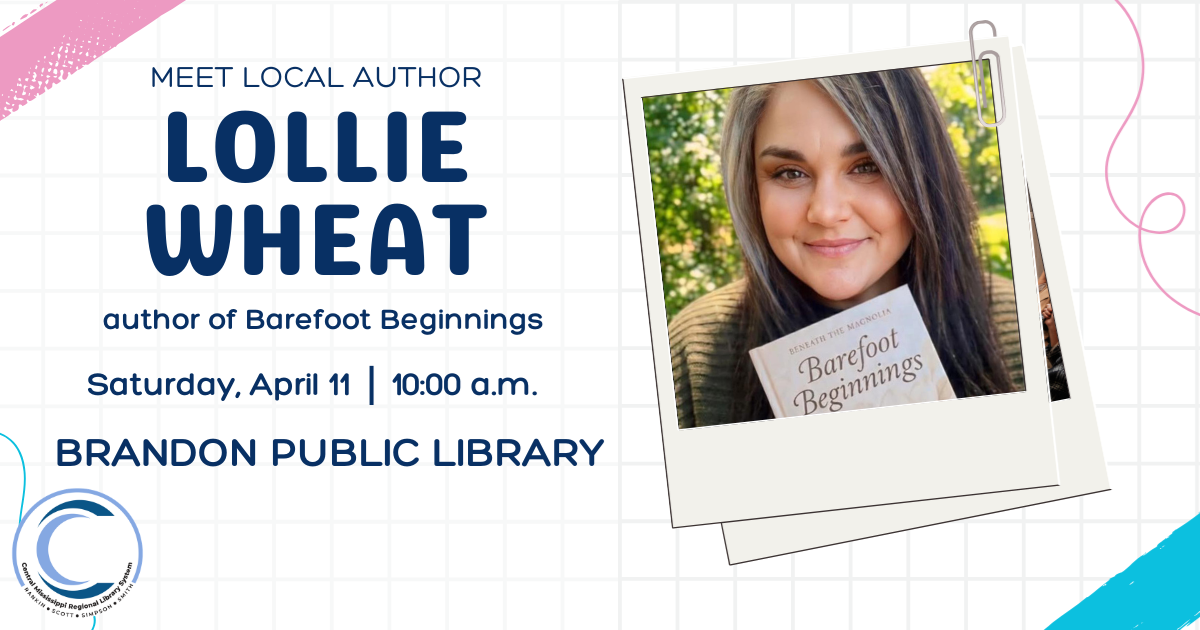 The Brandon Friends of the Library meet on the third Tuesday of every month! We would love to have you join us! Sponsored by the Brandon Friends of the Library! Join Mrs. Kelly once again from Peaceful Pursuits, as we create this beautiful doorhanger! Don't forget to call the library and save your spot. (601) 825-2672 Stop by and say hello to local author, Lollie Wheat. She will discuss her book, Barefoot Beginnings, with us as well as be available to autograph. |