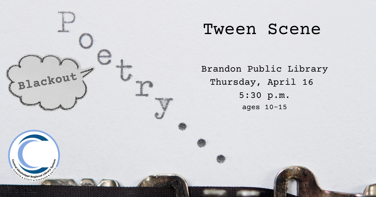 April is Poetry Month! This month for Tween Scene, we will be using old books to create all new and original poetry. We meet the third Thursday of each month at 5:30 p.m.