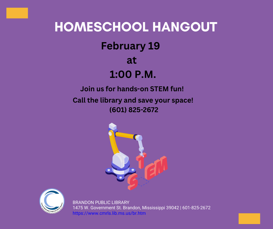 Thank you for making Homeschool Hangout a success in January. We had over 50 patrons attend! For this month's event, we will have a signup sheet. So, please call the library at 601-825-2672, if you are interested in attending!