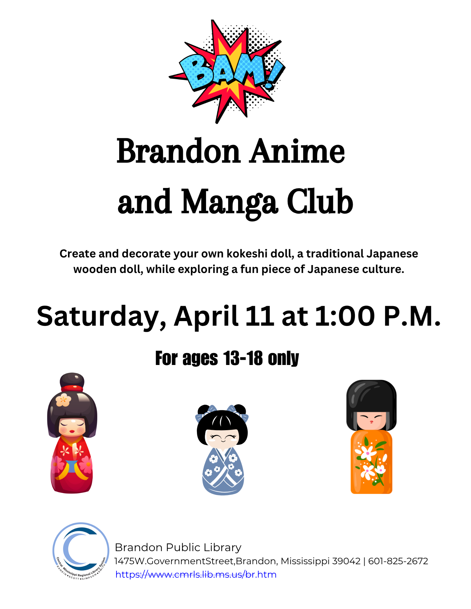 The Brandon Anime & Manga Club will be creating these adorable Japanese Kokeshi wooden dolls. Join us on Saturday, April 11 at 1:00 p.m. for all things anime & manga! |