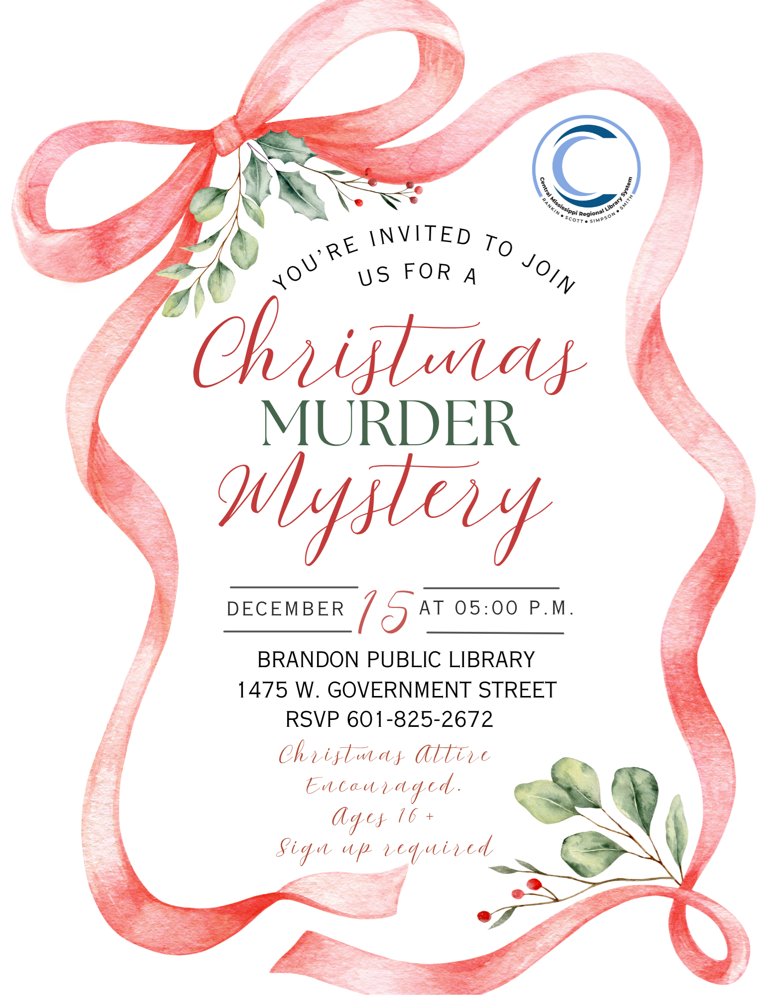 We invite you to join us for our first ever Christmas Murder Mystery. Call the library to save your spot!