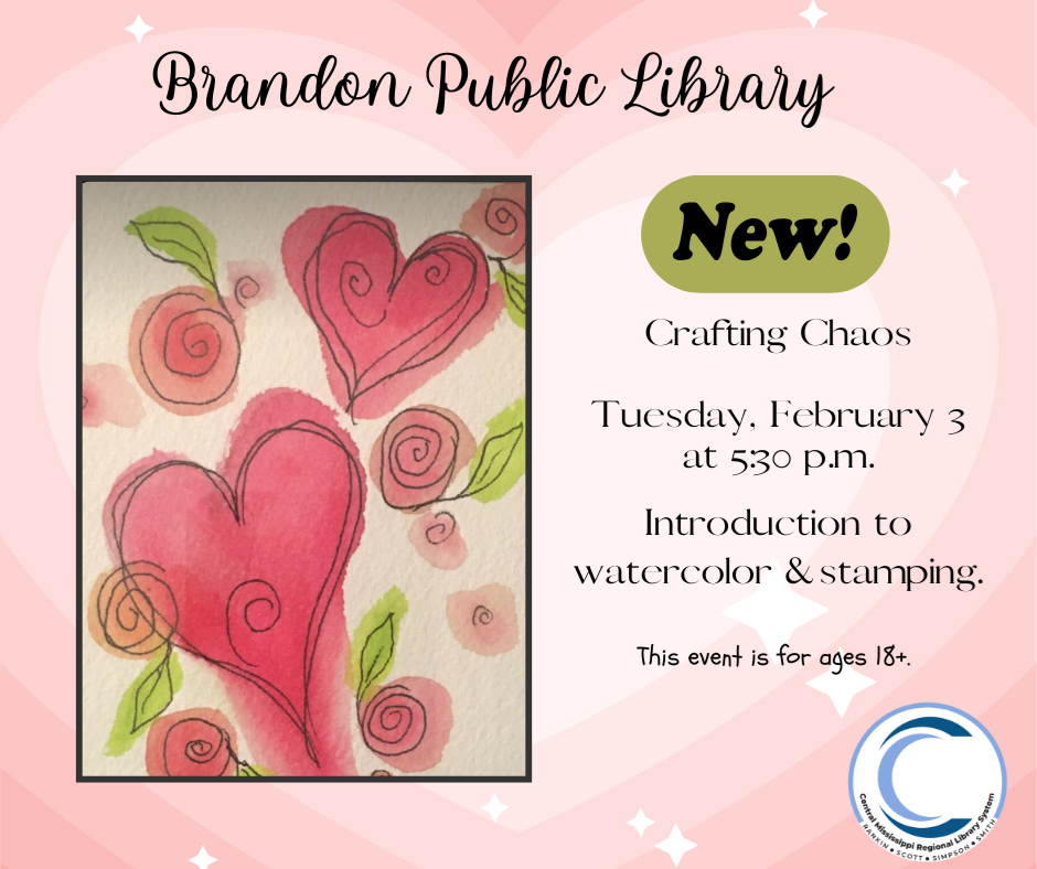 Tuesday, February 3 at 5:30 p.m. We also have a new crafting program, Crafty Chaos, where we will try new types of crafts each month. Ages 18+.