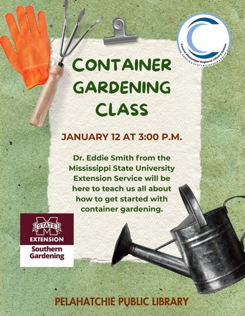 Senior Citizens' Social Tuesday, January 6, 11:00 a.m. Tuesday, January 20, 11:00 a.m. Join other seniors in your area to play games and socialize. Container Gardening Class Monday, January 12, 3:00 p.m. Dr. Eddie Smith from the Mississippi State University Extension Serivce will be here to teach us all about how to get started with container gardening. Brunch & Books: Adult Book Club Wednesday, January 21, 11:00 a.m. The Brunch & Books: Adult Book Club meets once a month on the third Wednesday at 11:00 a.m. We look forward to having you join us. Our December read is Winter of the World by Ken Follett. Stop by the library and pick up your copy! Friends of the Library Meeting Thursday, January 29, 3:30 p.m. Interested in being involved in your local library and community? Join the Friends of the Pelahatchie Public Library. We would love to have you!