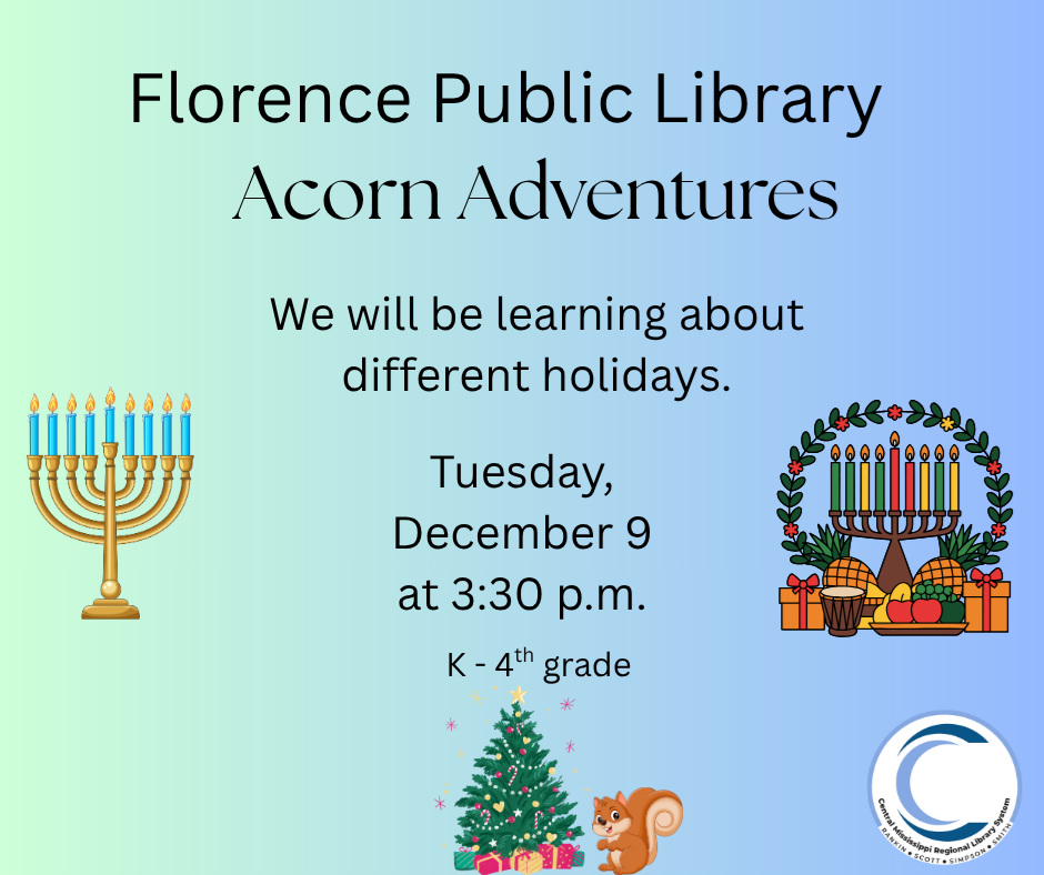 All CMRLS Libraries and the Administrative Office will close Tuesday, December 23, either at their regular hours or at 6:00 p.m. for the Christmas holiday. Regular library hours will resume Monday, December 29.