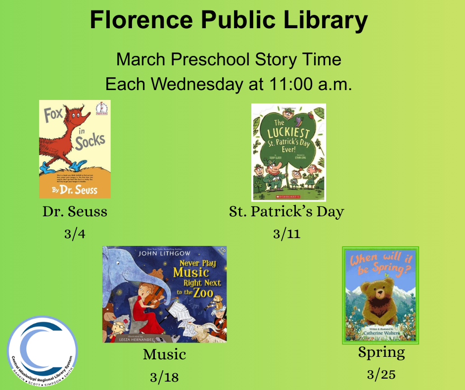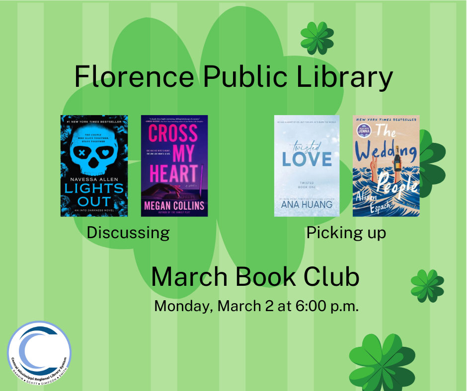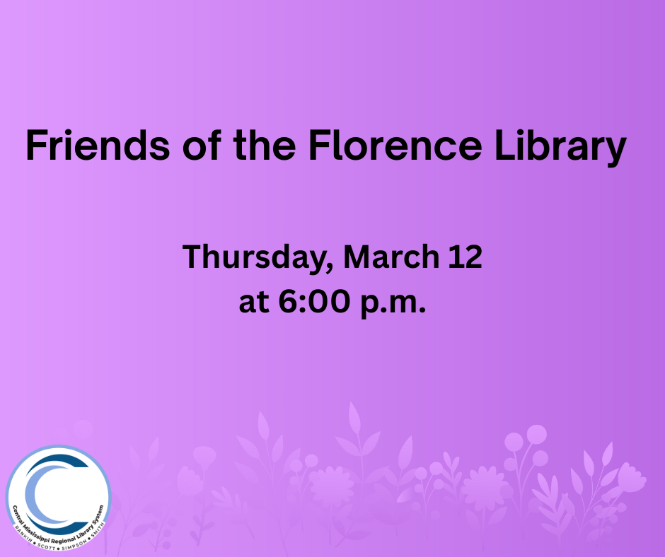 Book Club Every first Monday at 6:00 p.m. Must be 18+ Friends of the Florence Library Meeting Thursday, March 12 6:00 p.m. We invite you to get active with your community by joining our Friends of the Library. We discuss plans and fundraising ideas for supporting our library.