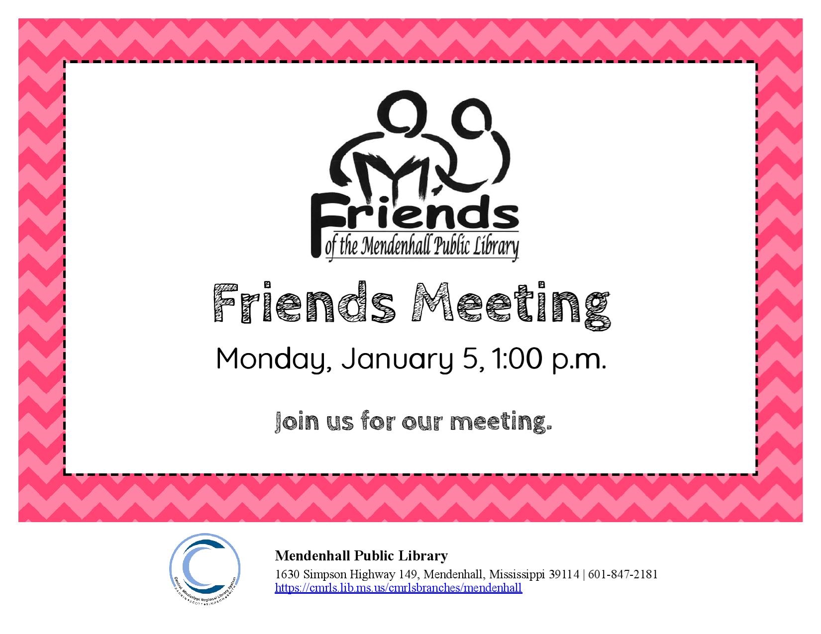 Friends MeetingMonday, March 2 at 1:00 p.m. Join the Friends for their bi-monthly meeting. They will be discussing upcoming fundraisers and how they can help serve the library.