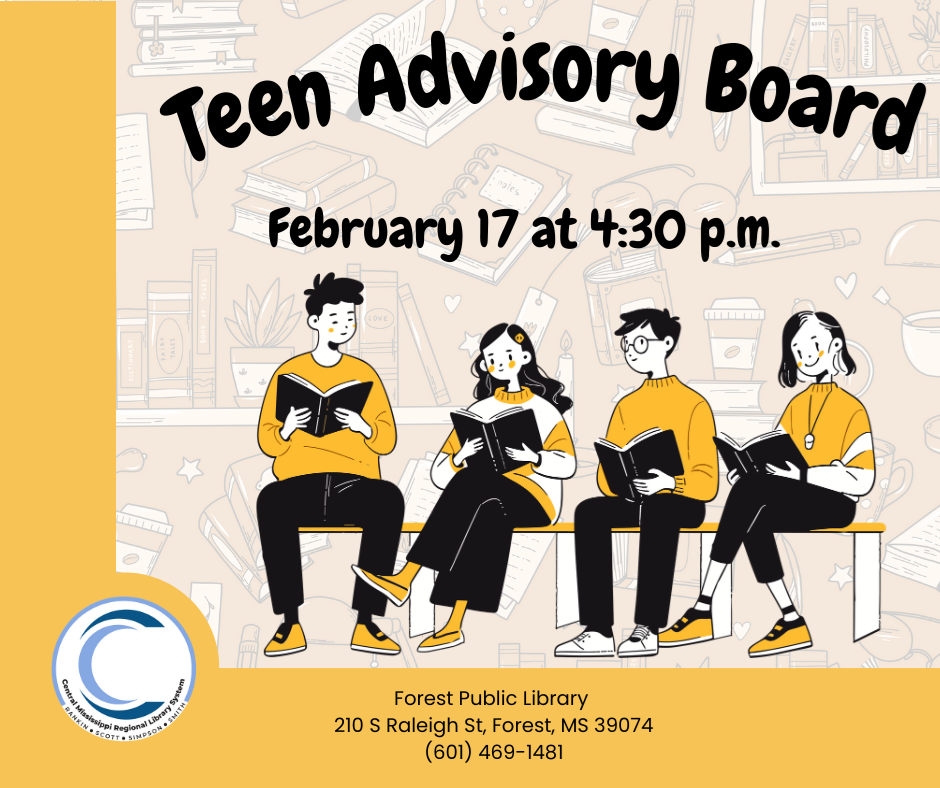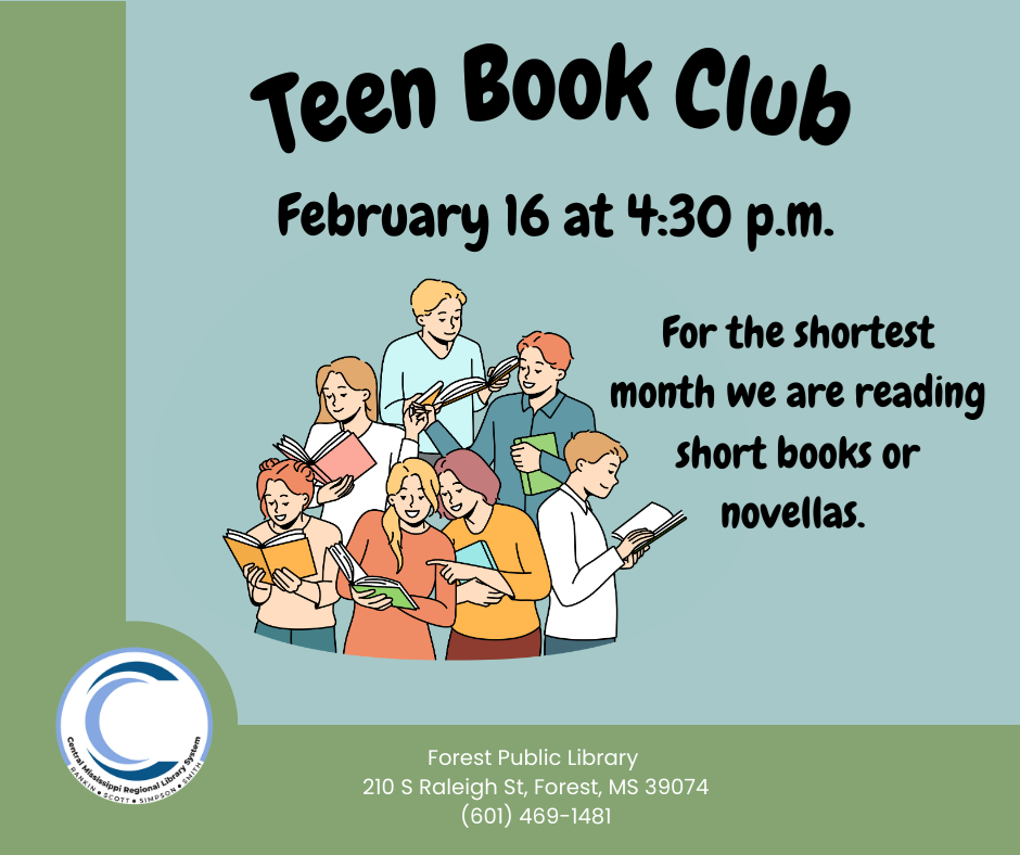 Teen Advisory Board: The Teen Advisory Board meets once a month and is a way for the teens in our community to work with library staff to create programs and other things that they want to see in the library just for teens. The meeting will be on February 17 at 4:30 p.m. Teen Book Club: For February's Teen Book Club, we are reading short books or novellas - a short book for a short month. Teens can choose whatever book they want to read and discuss. The meeting will be on February 23 at 4:30 p.m.