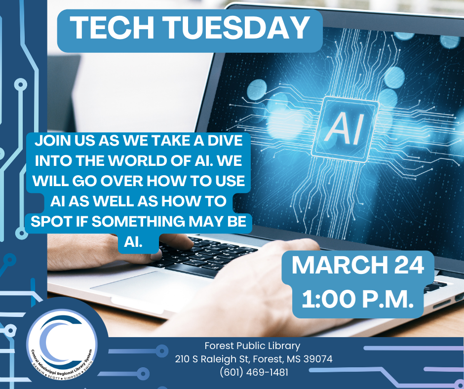 Tech Tuesday: This Tech Tuesday, on March 24 at 1:00 p.m., we will be going over AI. We will talk about how to spot if something may be AI-created. This will be the last Tech Tuesday, as we will be working on introducing one-on-one technology lessons.