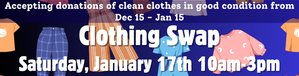 Many of us do some wardrobe pruning around the new year. We will hold a clothing swap January 17 with adult fall/winter clothing. You can drop off clean, lightly used clothes December 15-January 15 for the January 17 swap. (No undergarments or socks, please.) Please come to the swap even if you didn’t donate any clothes.