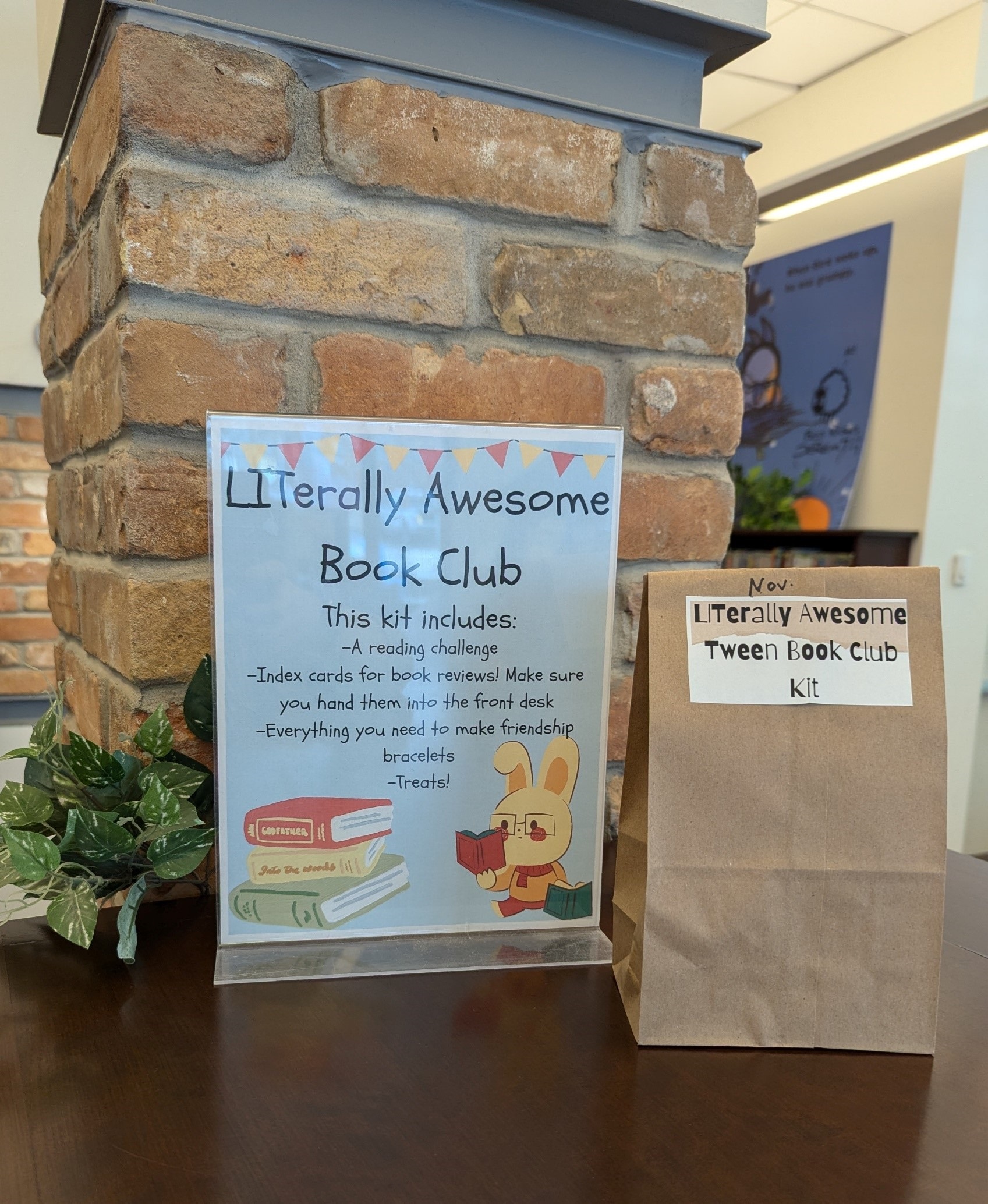 LITerally Awesome Tween Book Club Kit First Wednesday of the month kits go out Kit will include: two reading challenge options, craft and treat. If you like the book and would like to recommend it to others, write a review on the index card provided and drop off to the children’s librarian or front desk! For youth ages 8-12 yrs. While supplies last.