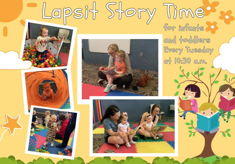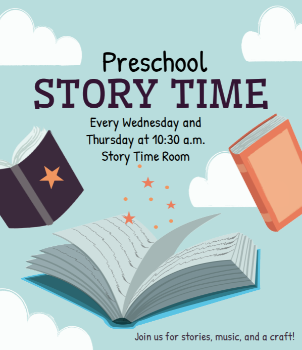 Lapsit Story Time Tuesdays 10:30 a.m. - 11:00 a.m. Bring your little one for stories and music. Preschool Story Time Wednesdays and Thursdays 10:30 a.m. - 11:00 a.m. Join us for Preschool Story Time! There will be stories, music, and a craft. Bring your preschooler and come join the fun!