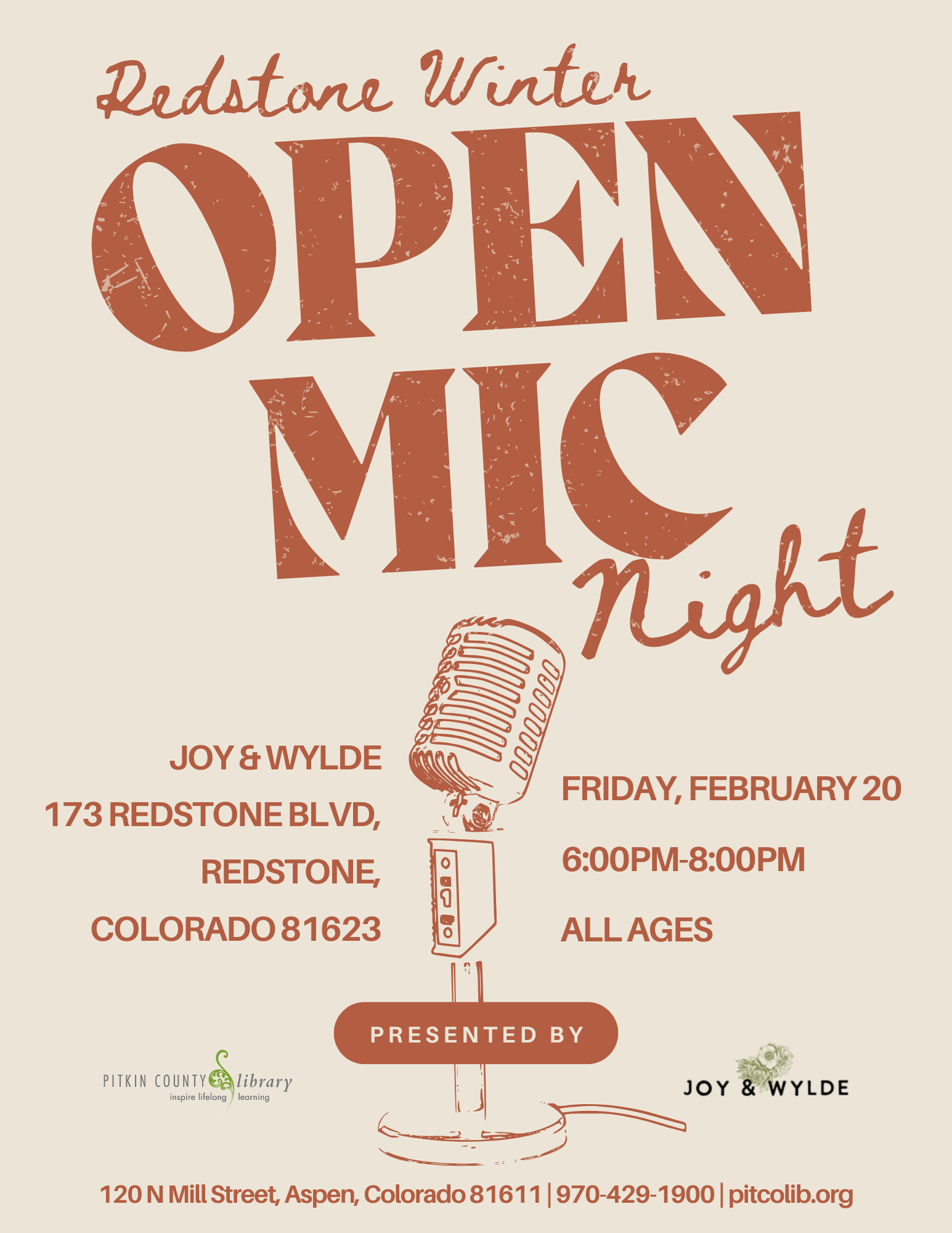 Redstone Winter Open Mic Night Friday, February 20 -- 6:00-8:00 pm Joy & Wylde, Redstone, CO