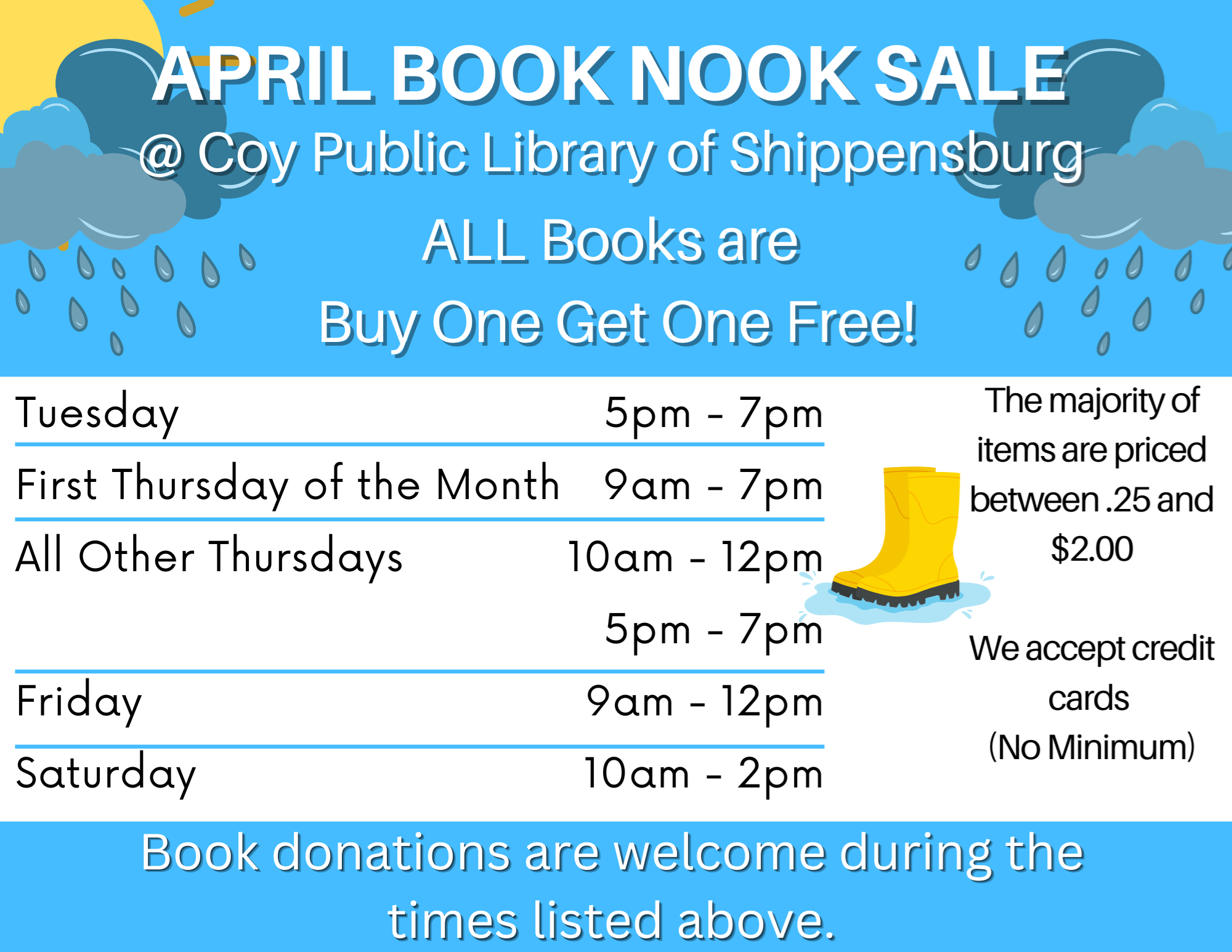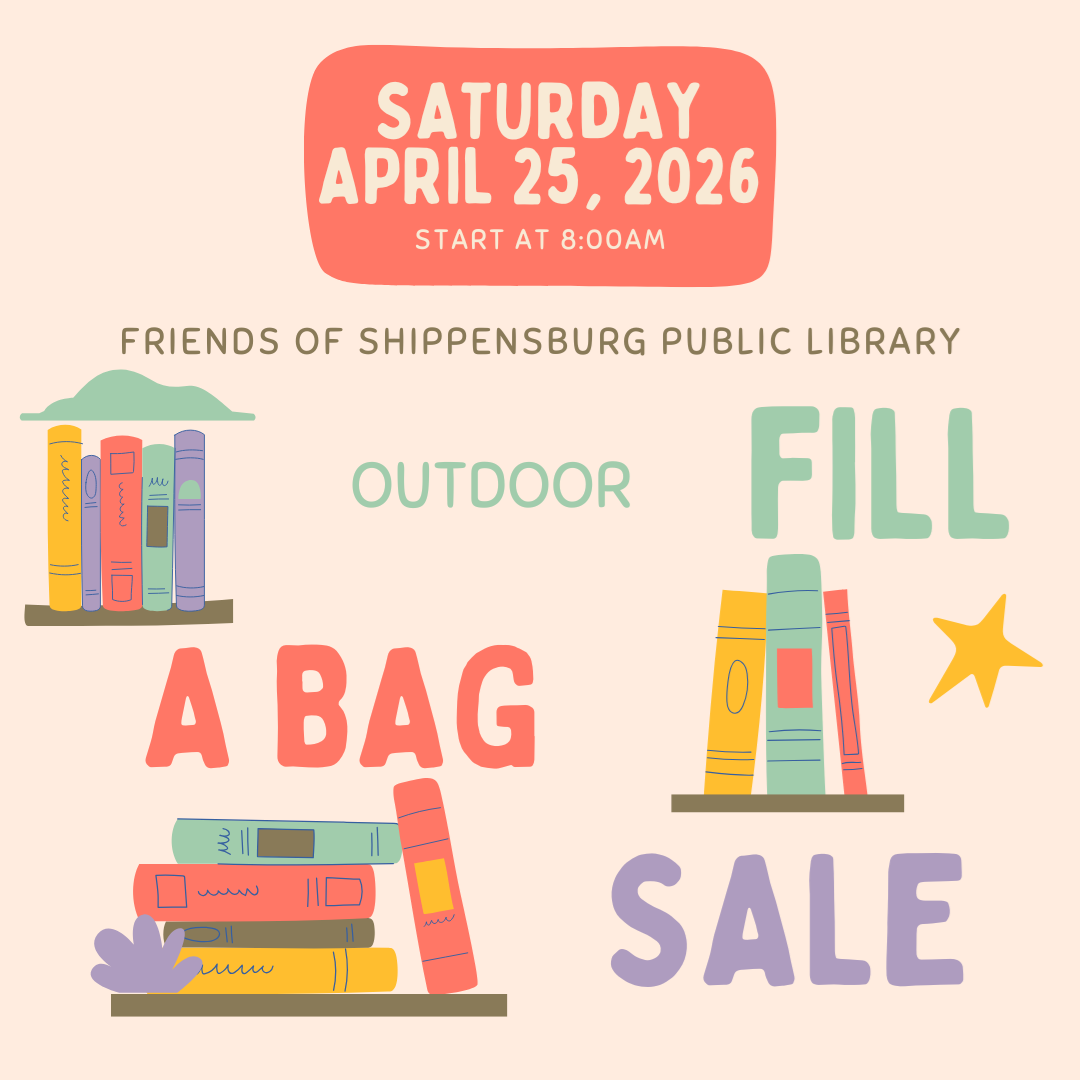 Book Nook Fill-a-Bag Sale Saturday, April 25 8:00 am-4:00 pm Save the date and get ready to visit the Book Nook Saturday, April 25th for the annual Friends of Shippensburg Public Library fill-a-bag sale! One bag of books is $3!