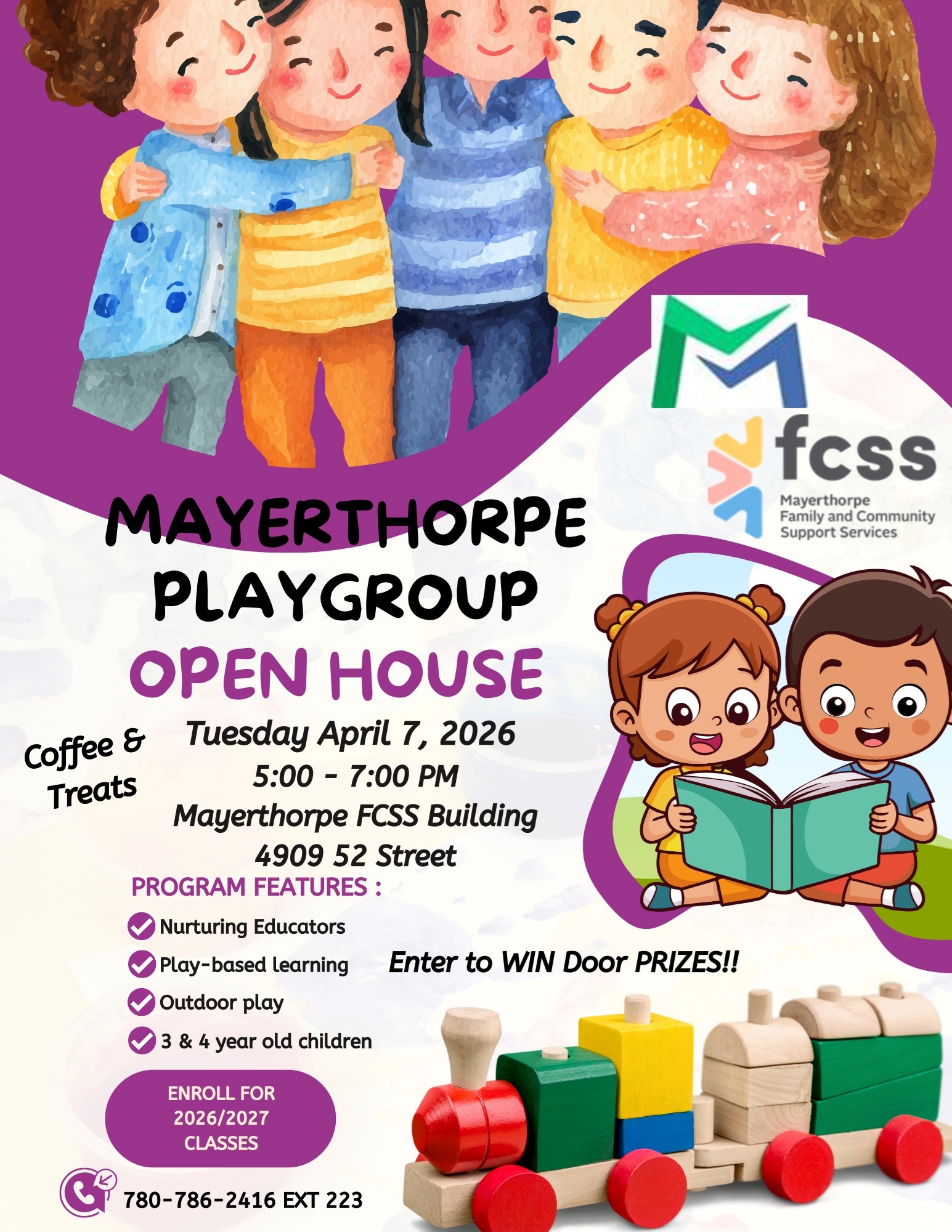 Mayerthorpe Playgroup Open House Little learners, big beginnings. Curious about preschool for your child? Visit the Mayerthorpe Playgroup Open House to meet the teachers, explore the program, and see how play-based learning supports young learners. Designed for children ages 3 and 4, the program features nurturing educators, engaging activities, and outdoor play. Enjoy coffee and treats, enter to win a door prize, and learn how to enroll for the 2026–2027 playgroup year When: Tuesday, April 7, 2026 | 5–7 PM Where: Mayerthorpe FCSS Building Cost: Free Drop in, explore the program, and sign up for the 2026–2027 playgroup year.