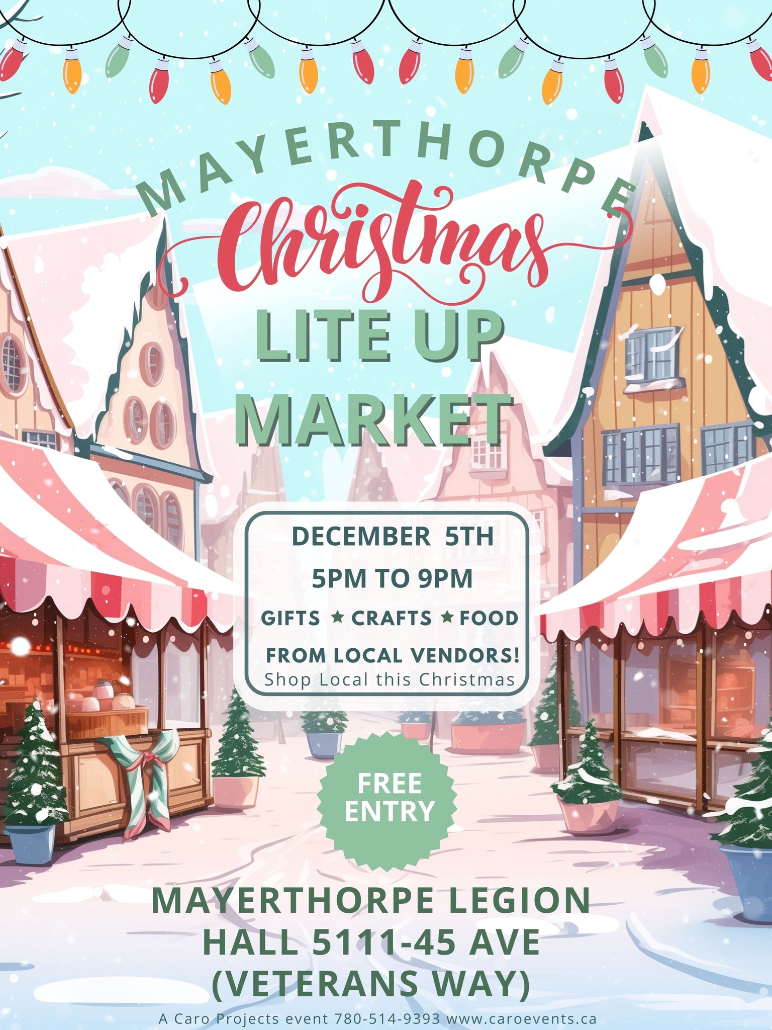 Mayerthorpe Christmas Lite Up Market Shop Local & Celebrate the Season! Get into the holiday spirit with an evening of festive shopping, cozy treats, and community cheer! During Mayerthorpe’s Lite Up festivities, the annual Christmas Lite Up Market brings together local vendors, handmade goods, and delicious food—all under one warm, welcoming roof. Whether you’re hunting for the perfect gift, stocking up on holiday goodies, or just enjoying the merry atmosphere, this market is a great way to support local creators and kick off the season in style. And don’t forget to grab a hot chocolate from the Legion while you browse! When: Fri, Dec 5 | 5 – 9pm Where: Mayerthorpe Legion Hall, 5111–45 Ave (Veterans Way) Cost: Free entry Shop local, enjoy the lights, and be part of the Christmas magic in Mayerthorpe!
