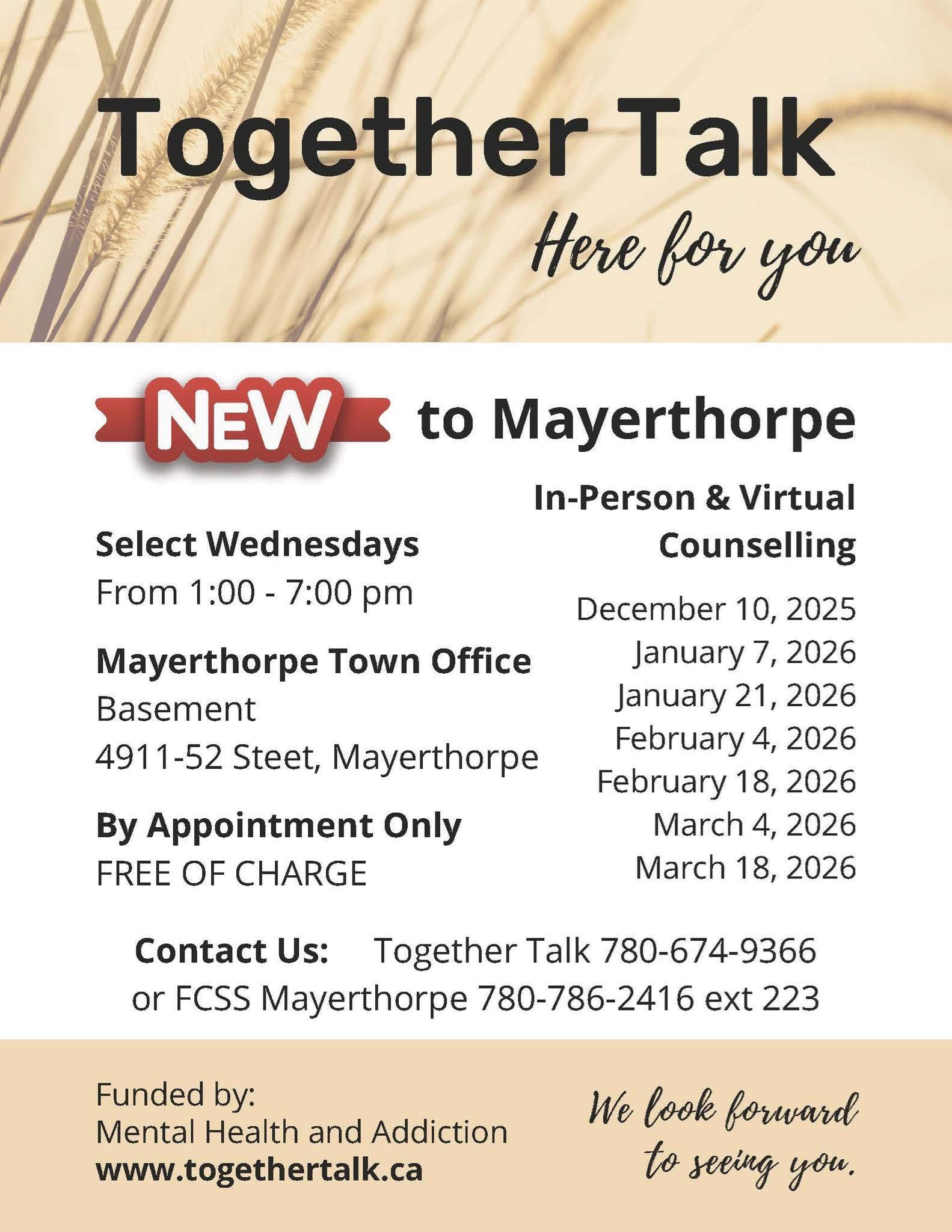 Together Talk Counselling Here for You in Mayerthorpe Looking for someone to talk to? Together Talk offers free in-person and virtual counselling in Mayerthorpe. Their trained counsellors provide support, guidance, and a safe, confidential space to share. When: Wed, 1 – 7pm Upcoming dates: • Dec 10, 2025 • Jan 7 & 21, 2026 • Feb 4 & 18, 2026 • Mar 4 & 18, 2026 Where: Mayerthorpe Town Office (Basement), 4911–52 Street Cost: Free (by appointment only) Book an appointment: Together Talk: 780-674-9366 FCSS Mayerthorpe: 780-786-2416 ext. 223