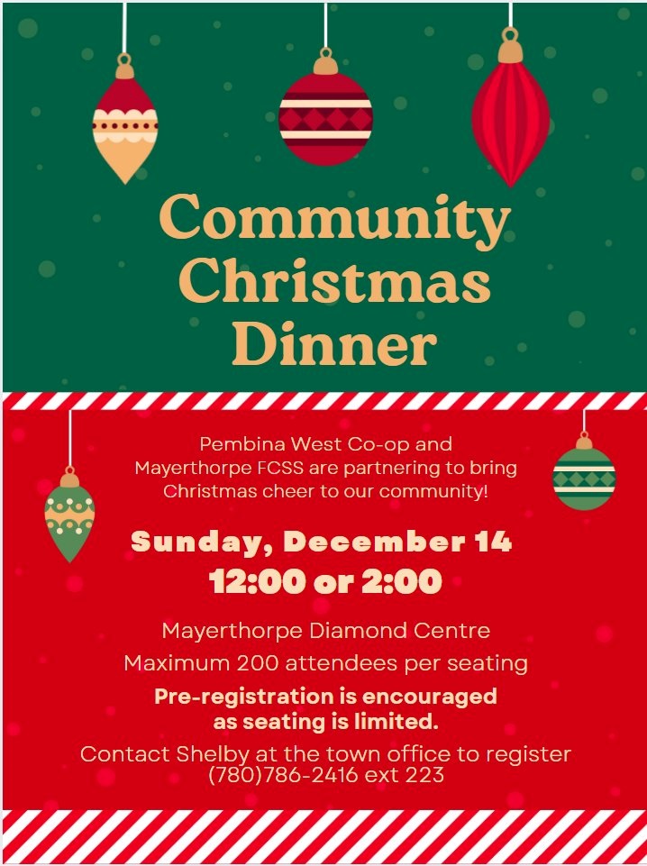 Community Christmas Dinner A festive meal for the whole community to enjoy! Pembina West Co-op and Mayerthorpe FCSS are partnering to bring Christmas cheer with a warm holiday dinner for all to attend. When: Sun, Dec 14 — Choose from 12pm or 2pm seating Where: Mayerthorpe Diamond Centre Capacity: Maximum of 200 attendees per seating Pre-registration is encouraged, as seating is limited. To register, contact Shelby at the Town Office: 780-786-2416 ext. 223