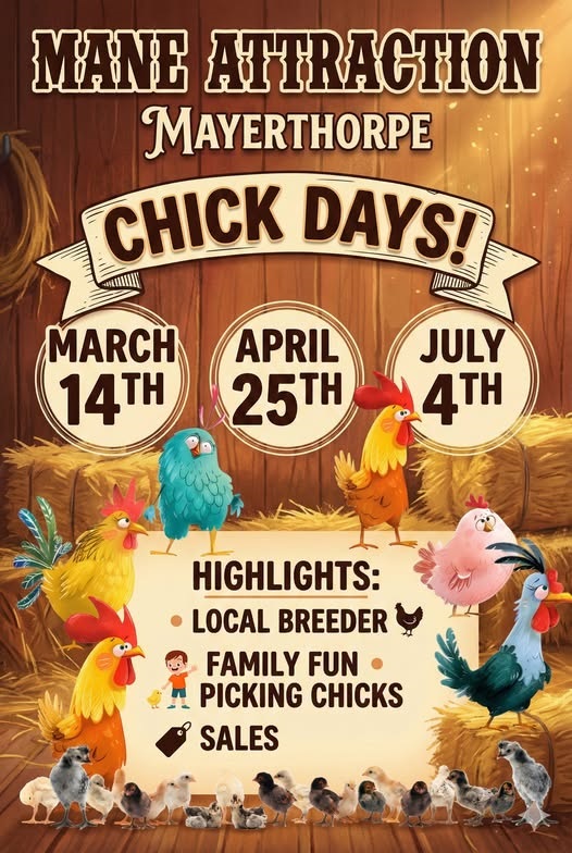 Mane Attraction Feed & Ranch Supply Chick Days Are Back! Chick Days return in 2026, giving locals the chance to buy healthy, local birds right in town. In partnership with Hagon Farms in Barrhead, a variety of breeds will be available, including Olive Egger, Maran Mix, Lavender Orpington, Buff Orpington, Barred Rock, and Silkies. Feeders, waterers, heaters, locally milled feed, and fresh bedding will also be available, with special in-store deals on Chick Days. When: April 25 · July 4 Arrive early — Chick Days are popular and sell out fast!