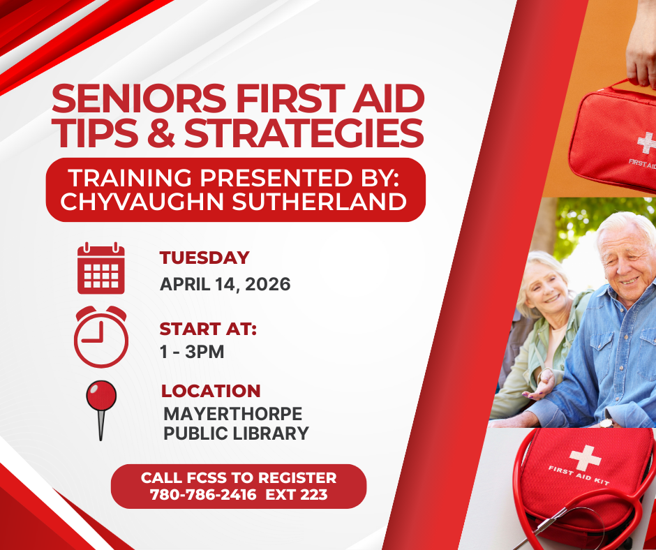 Seniors’ First Aid Tips & Strategies Stay safe, confident, and prepared In partnership with Mayerthorpe FCSS, join Chyvaughn Sutherland for a practical, drop-in session on first aid for seniors. Learn how to help yourself when you’re alone, handle burns, injuries, choking, and more, and discover at-home safety tips and procedures to keep you secure. Registration required Contact Shelby at 780 786 2416 ext 223.