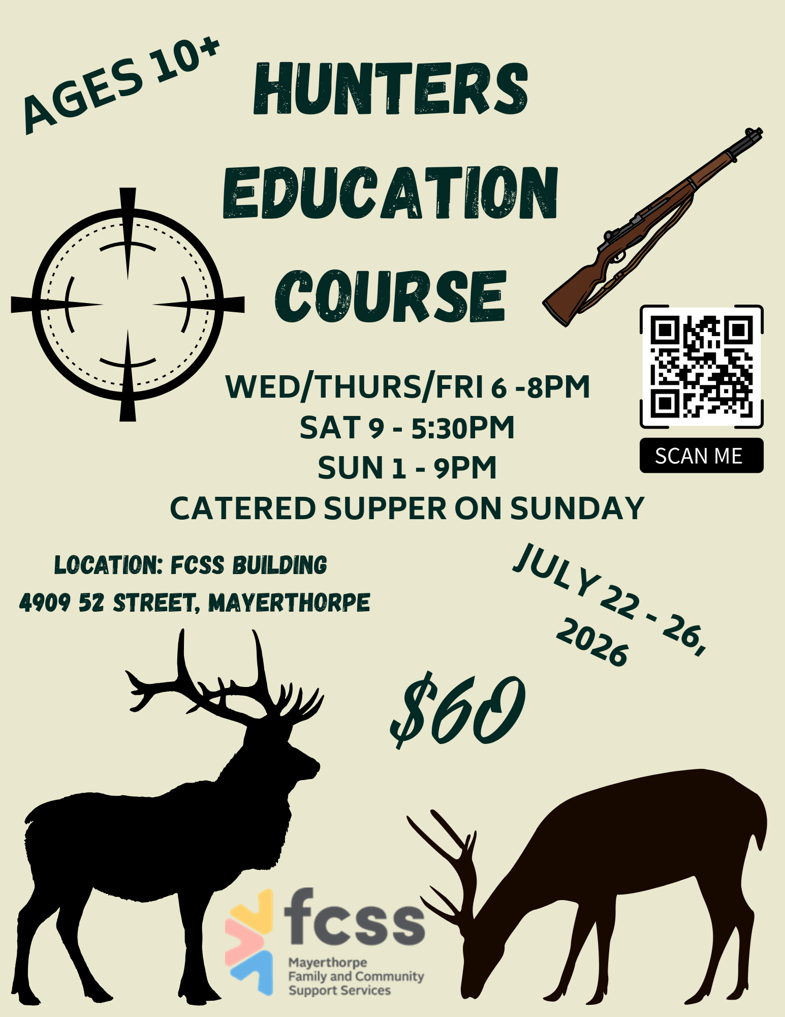 Hunters Education CourseJoin our Hunters Education Course in Mayerthorpe! Open to ages 10+, this five‑day program runs July 22–26, 2026 at the FCSS Building. Sessions take place Wed–Fri (6–8 PM), Saturday (9–5:30), and Sunday (1–9 PM), with a catered supper on Sunday. The cost is $60, and you can register by scanning the QR code on the poster. Contact FCSS for any questions 780-786-2416 EXT 223. fcss@mayerthorpe.ca