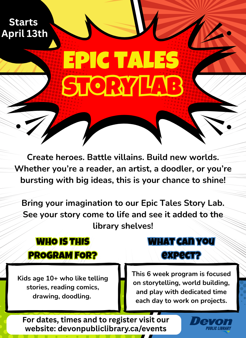 Epic Tales: Story Lab Mondays: 4:00-5:00pm April 13 April 27 May 11 May 25 June 8 June 22 This 6 week program is focused on storytelling, world building, and play with dedicated time each day to work on projects. Create heroes. Battle villains. Build new worlds.Whether you’re a reader, an artist, a doodler, or you’re bursting with big ideas, this is your chance to shine! Bring your imagination to our Epic Tales Story Lab. See your story come to life and see it added to the library shelves! Ages: Kids age 10+ who like telling stories, reading comics, drawing, doodling. Cost: FREE |