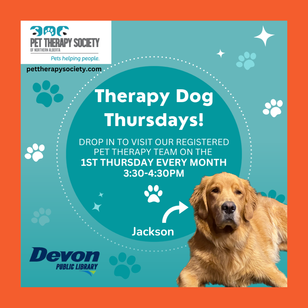 Therapy Dog Thursdays Thursday, April 2, 3:30-4:30pm Drop in visit Therapy Dog Jackson, and his human, Susan. Ages: ALL 11 & under must be accompanied by an adult Location: Library Main Area Cost: FREE Drop-in