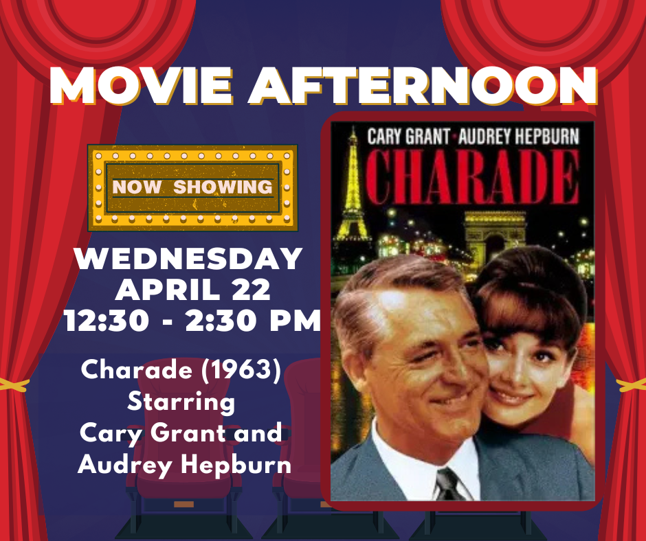 Movie Afternoon Wednesday, April 22, 12:30pm Drop-in for popcorn, and watch a movie on our big screen, the 4th Wednesday of each month from 12:30-2:30pm. The April movie is Charade (1963), starring Cary Grant and Audrey Hepburn |